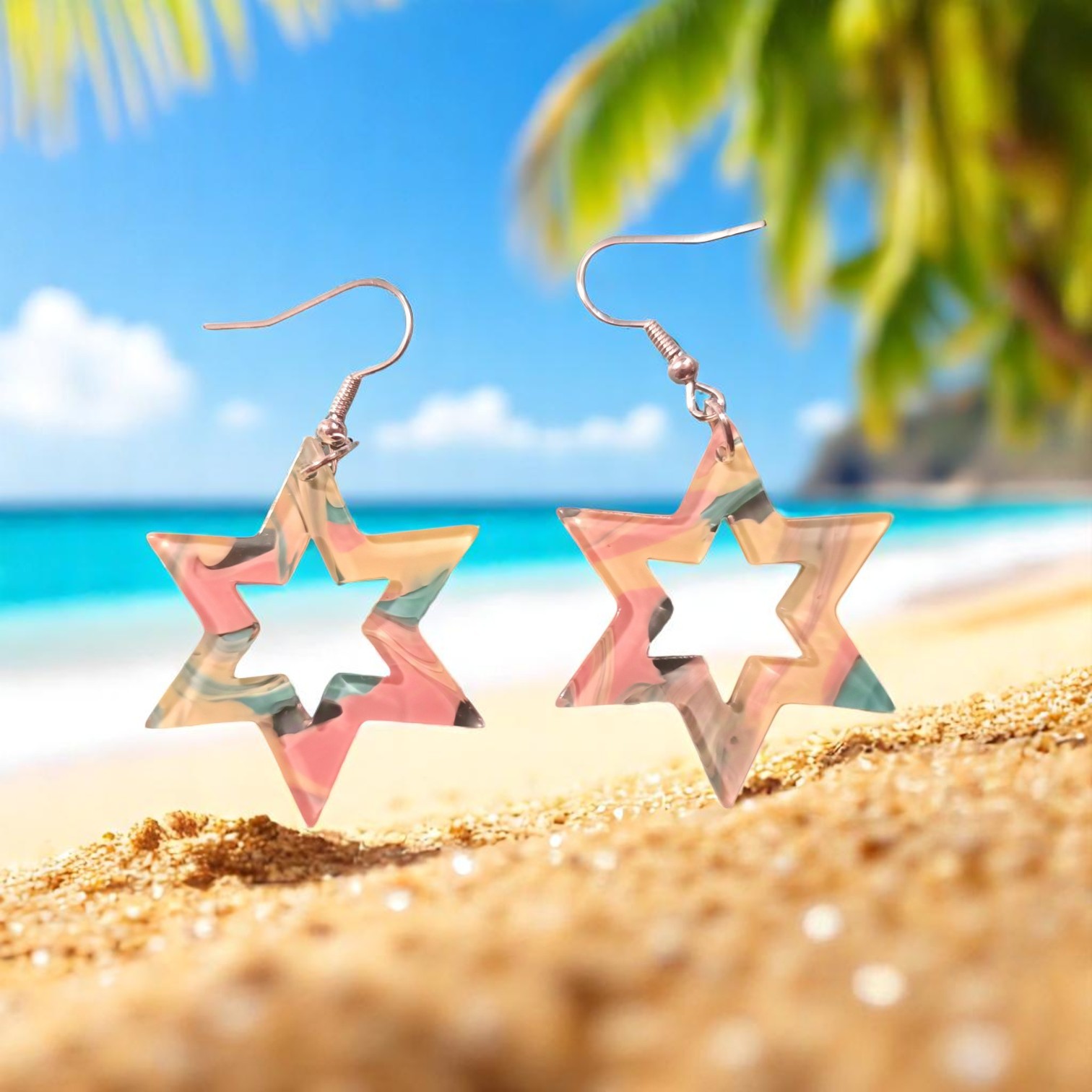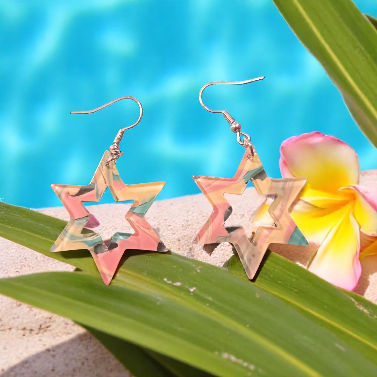 Découvrez cette magnifique paire de boucles d’oreilles en résine époxy, conçues pour apporter une touche d’originalité et de fraîcheur à votre style. Chaque boucle d’oreille est façonnée en forme d’étoile, un symbole de rêve et d’évasion, pour un look à la fois ludique et élégant.