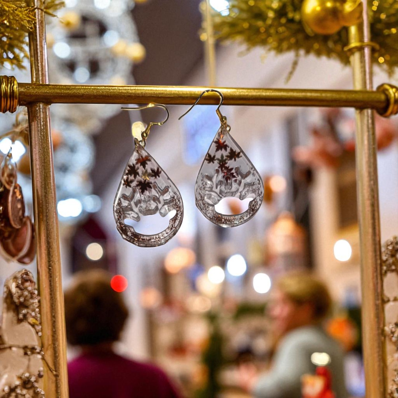 Ajoutez une touche de magie naturelle à votre collection de bijoux avec cette élégante paire de boucles d’oreilles en résine époxy transparente. Chaque pièce légère met en valeur un magnifique cerf en 3D, entouré de délicates décorations d’hiver et d’automne, créant une œuvre d’art suspendue à vos oreilles.