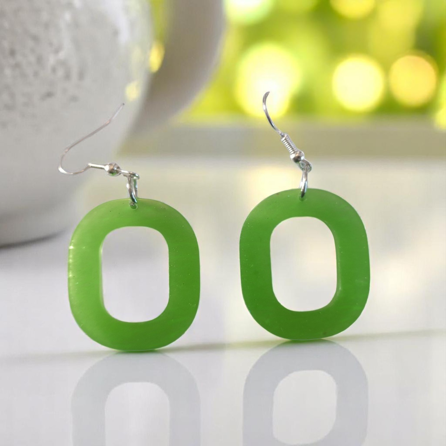 Il s’agit d’une paire de boucles d’oreilles en résine époxy vert pomme, au design moderne en forme de lettre O. Légères, confortables et élégantes, elles sont parfaites pour toutes les occasions, apportant une touche de fraîcheur et de style à votre look. Leur finition soignée et leur couleur vive en font un accessoire tendance, idéal pour celles qui aiment allier simplicité et originalité.