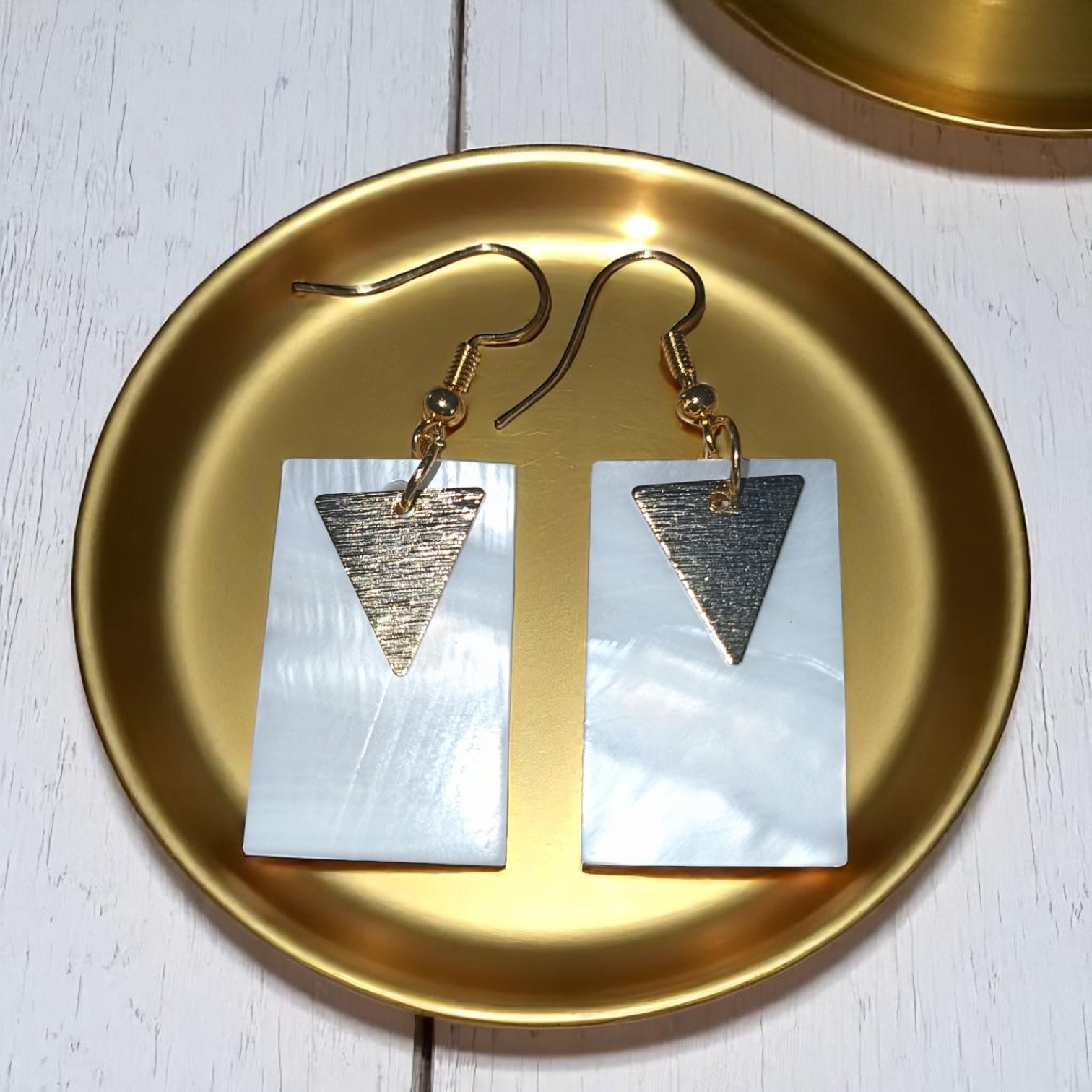 Apportez une touche de simplicité élégante à votre style avec cette paire de boucles d’oreilles modernes. Chaque bijou se compose d’une petite plaque rectangulaire en résine époxy blanche, au fini lisse et brillant, qui offre une apparence épurée et raffinée. Sur le dessus de chaque plaque, un petit triangle doré vient ajouter une note de sophistication et de contraste, soulignant la finesse du design.