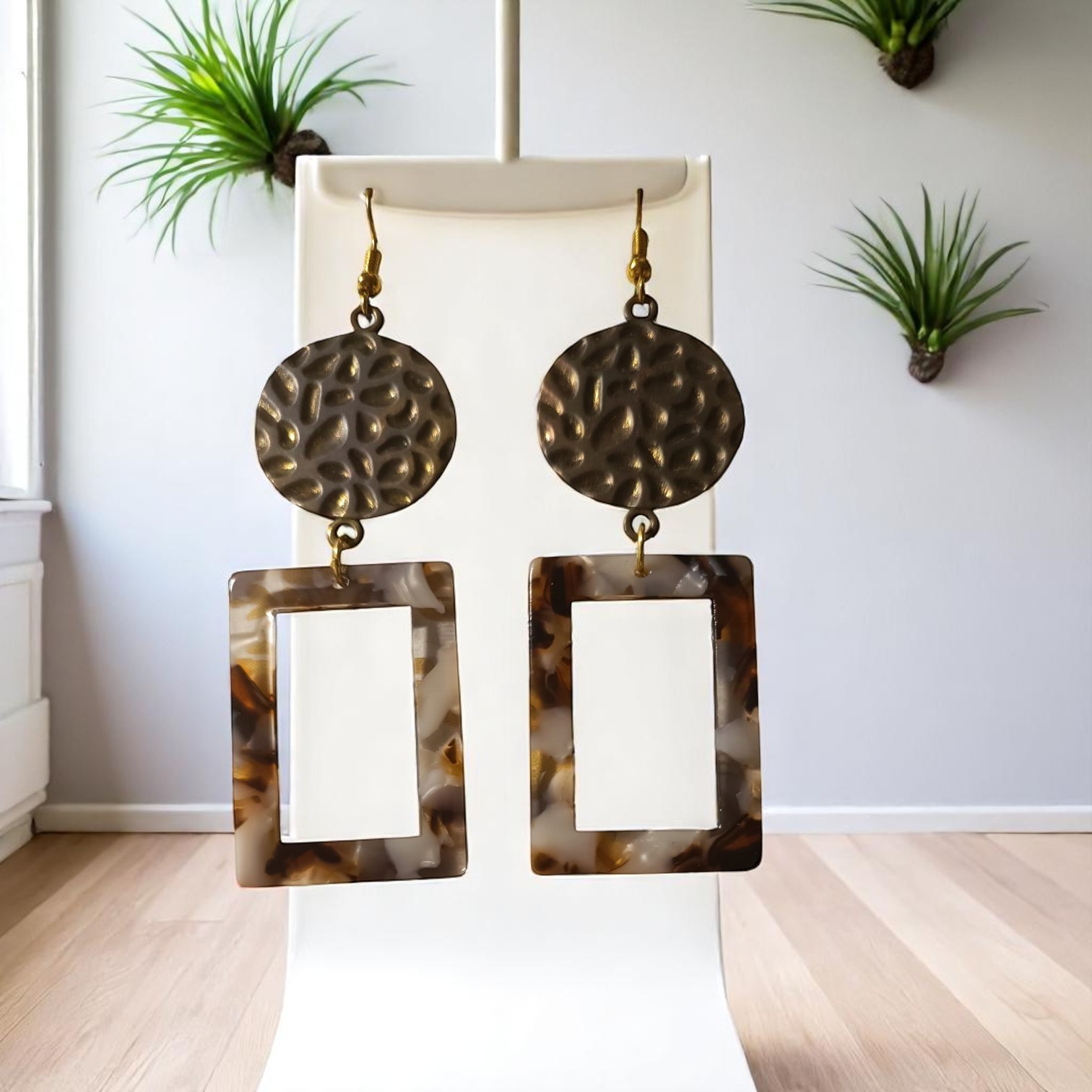 Apportez une touche de charme et d’élégance à votre style avec cette magnifique paire de boucles d’oreilles. Chaque bijoux se compose d’un rectangle en résine époxy aux nuances chaleureuses de marron et beige, évoquant la douceur de la terre et la beauté naturelle. La surface du rectangle est ornée de motifs floraux délicats, finement gravés ou peints, qui rappellent la finesse et la légèreté de la nature, apportant une touche de romantisme et de poésie à chaque pièce.