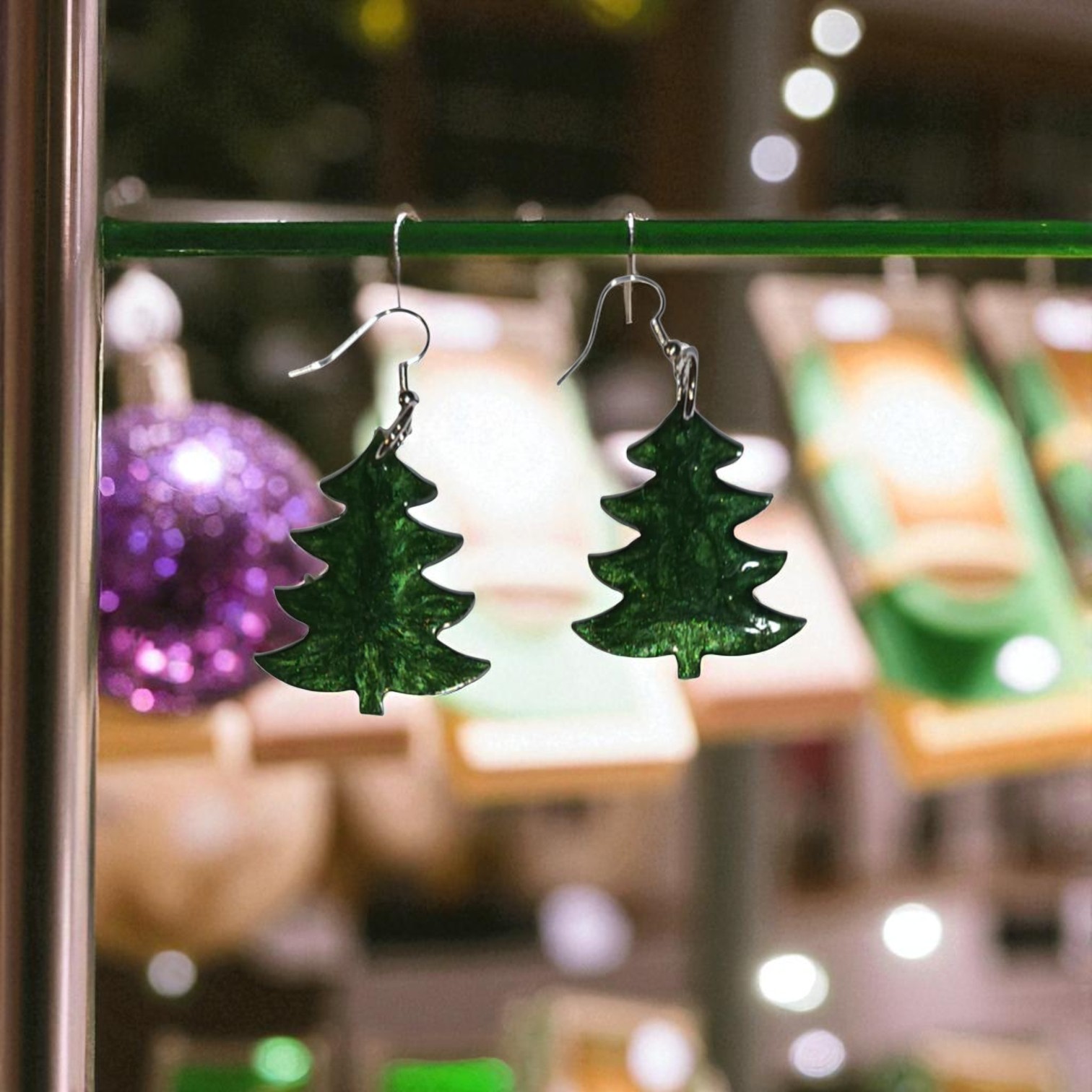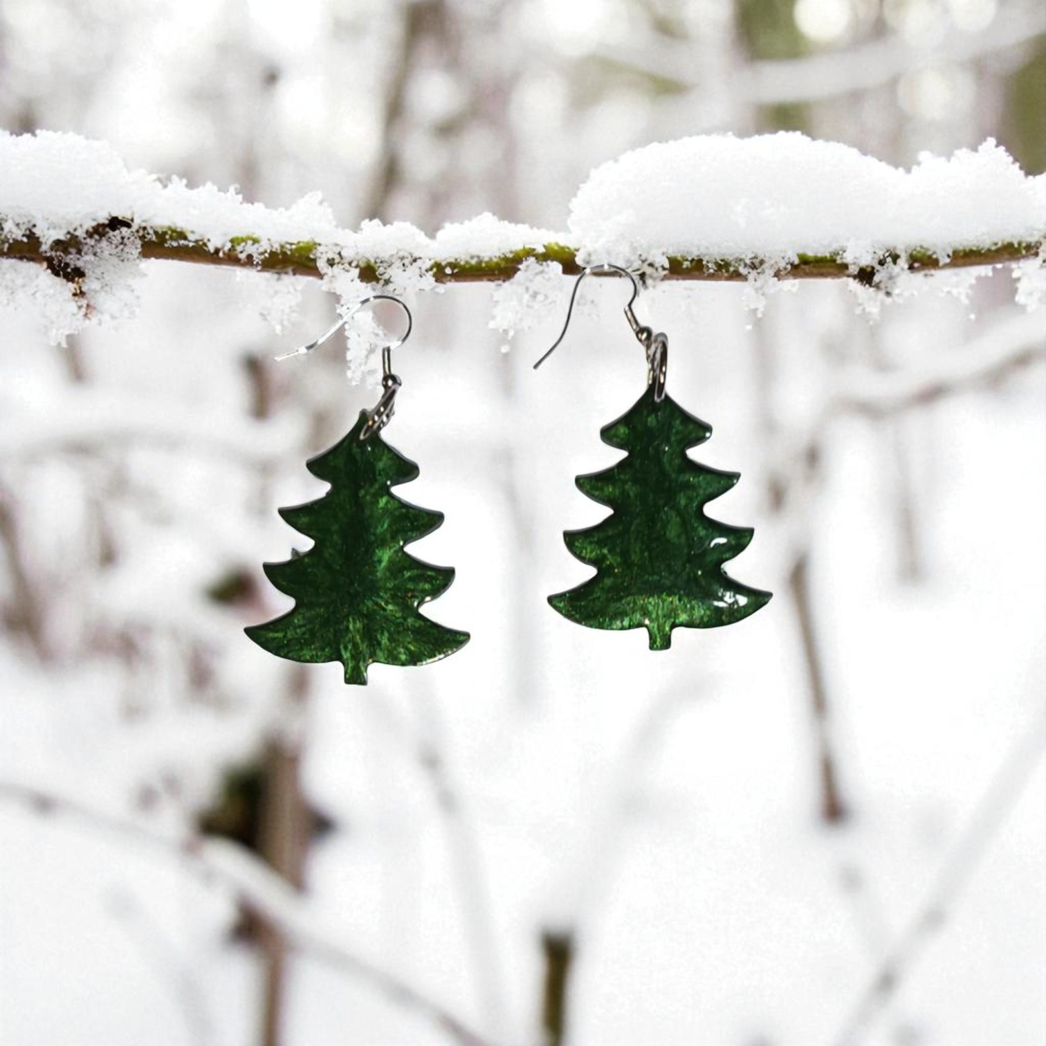 Ajoutez une touche festive à votre look avec cette délicieuse paire de boucles d’oreilles en résine époxy de couleur vert foncé brillant. Chaque boucle représente un adorable petit sapin, capturant l’esprit convivial et joyeux des fêtes.
