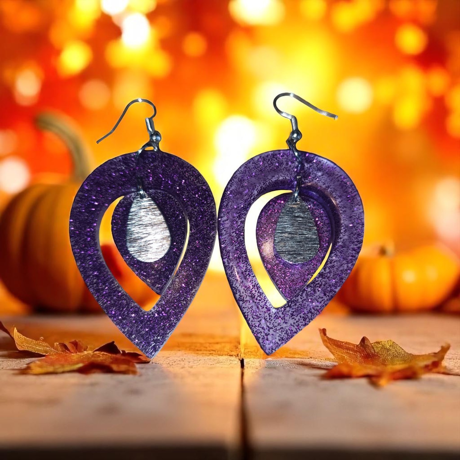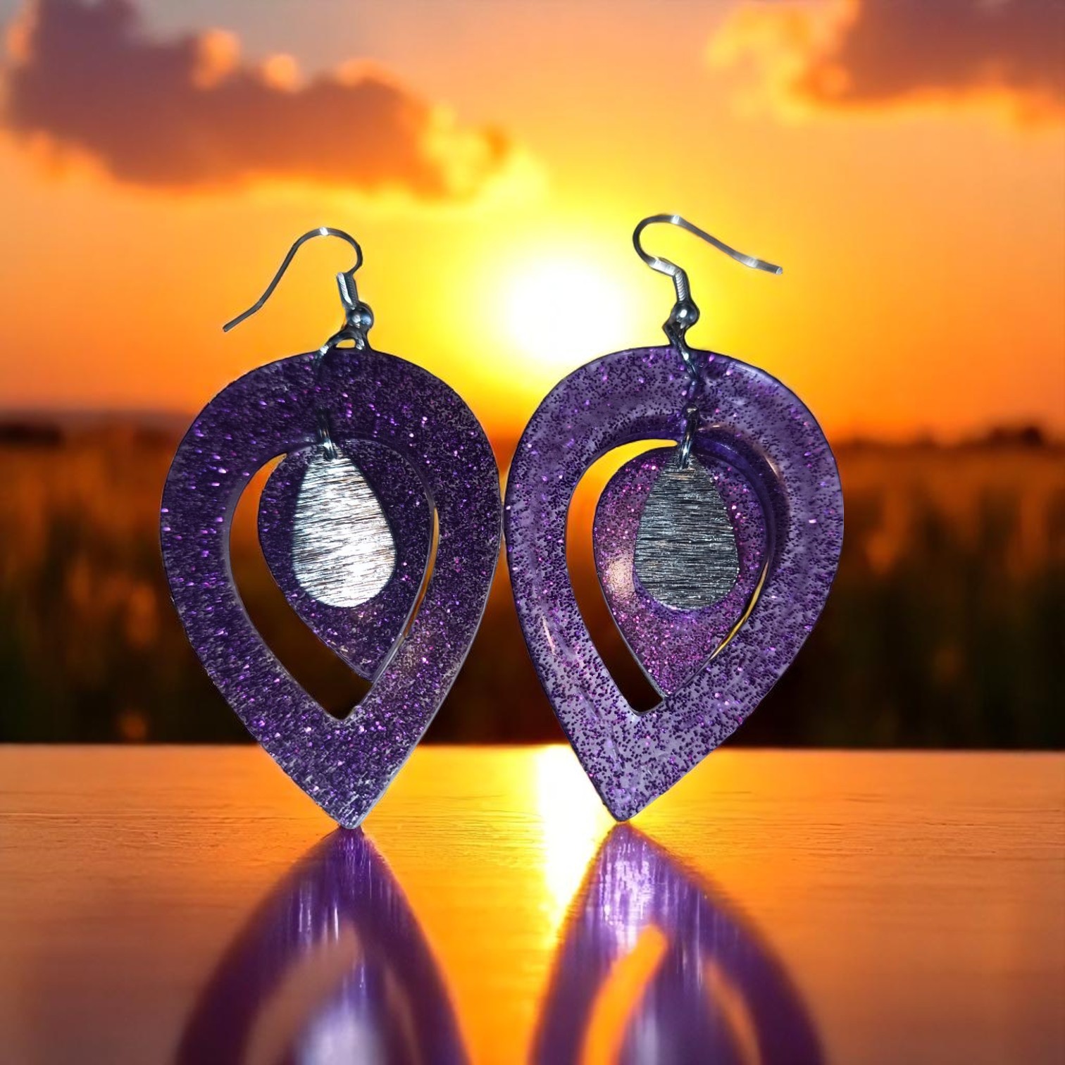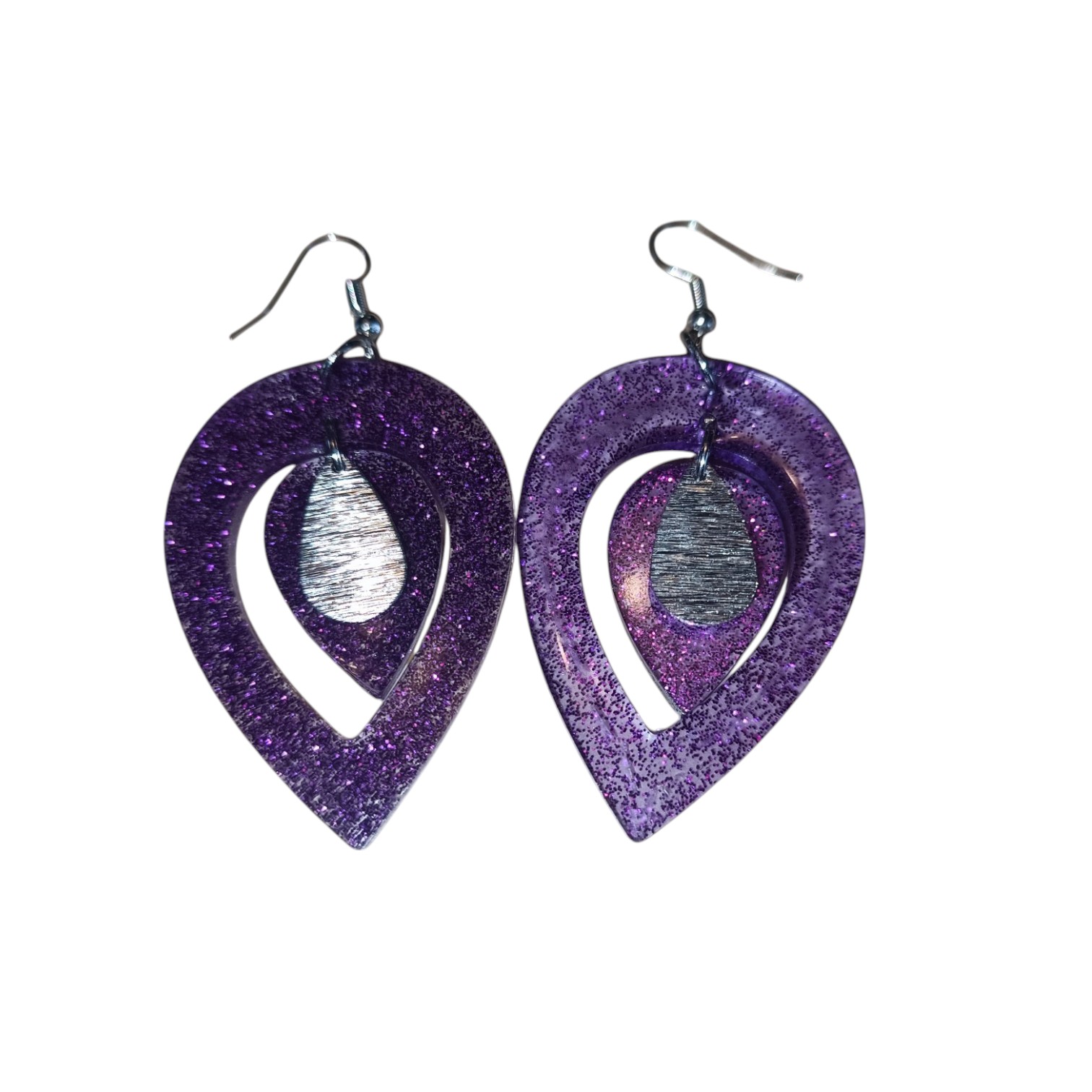- La surface de chaque boucle d’oreille est ornée de paillettes violettes qui captent la lumière à chaque mouvement, créant un effet scintillant et dynamique.