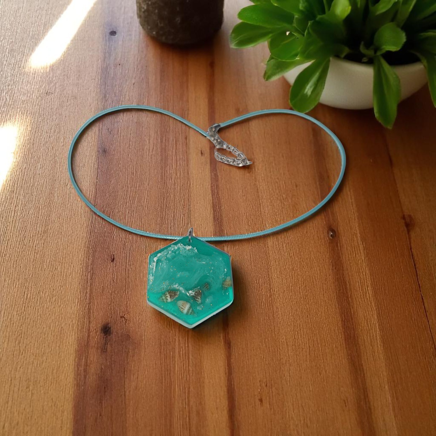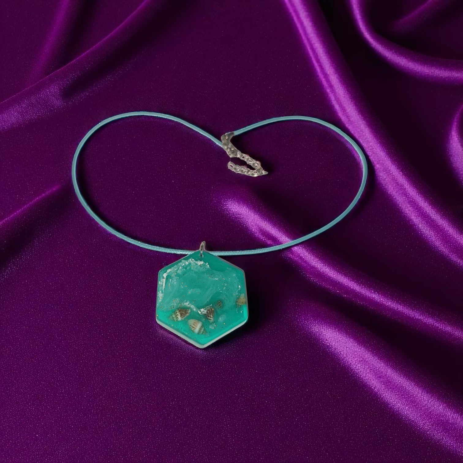 Imaginez un magnifique collier orné d’un médaillon à six côtés, évoquant la beauté de la mer. Les couleurs dominantes sont un bleu profond et un vert turquoise, rappelant les eaux cristallines et apaisantes de la mer. Le médaillon est réalisé en résine époxy, ce qui lui confère une finition brillante et résistante, tout en laissant apparaître de délicats coquillages enfermés à l’intérieur. Ces coquillages, soigneusement sélectionnés, apportent une touche naturelle et authentique, évoquant la plage et la douceur des vacances.
