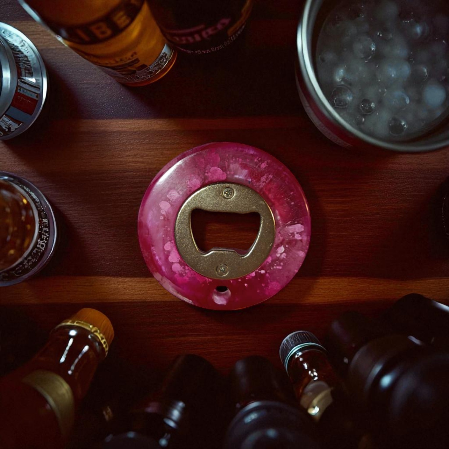 Ajoutez une touche de charme à vos moments de convivialité avec ce décapsuleur rond en résine époxy, arborant un élégant motif rose marbré.