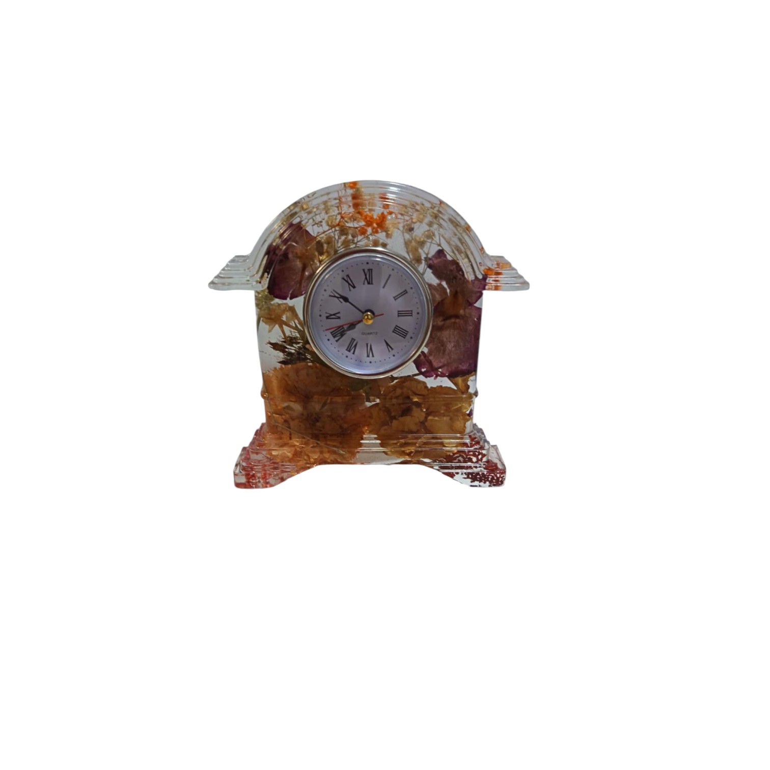 - Fleurs Séchées : Une sélection de fleurs séchées, tels que des roses, et d’autres fleurs soigneusement déposées pour préserver leur beauté naturelle. L’horloge présente un cadran inspiré des horloges classiques, avec des chiffres romains ou des index élégants qui évoquent l’artisanat d’antan. Le fond transparent permet aux fleurs de ressortir, créant un effet visuel captivant qui attire l’œil et instille une atmosphère romantique et nostalgique.