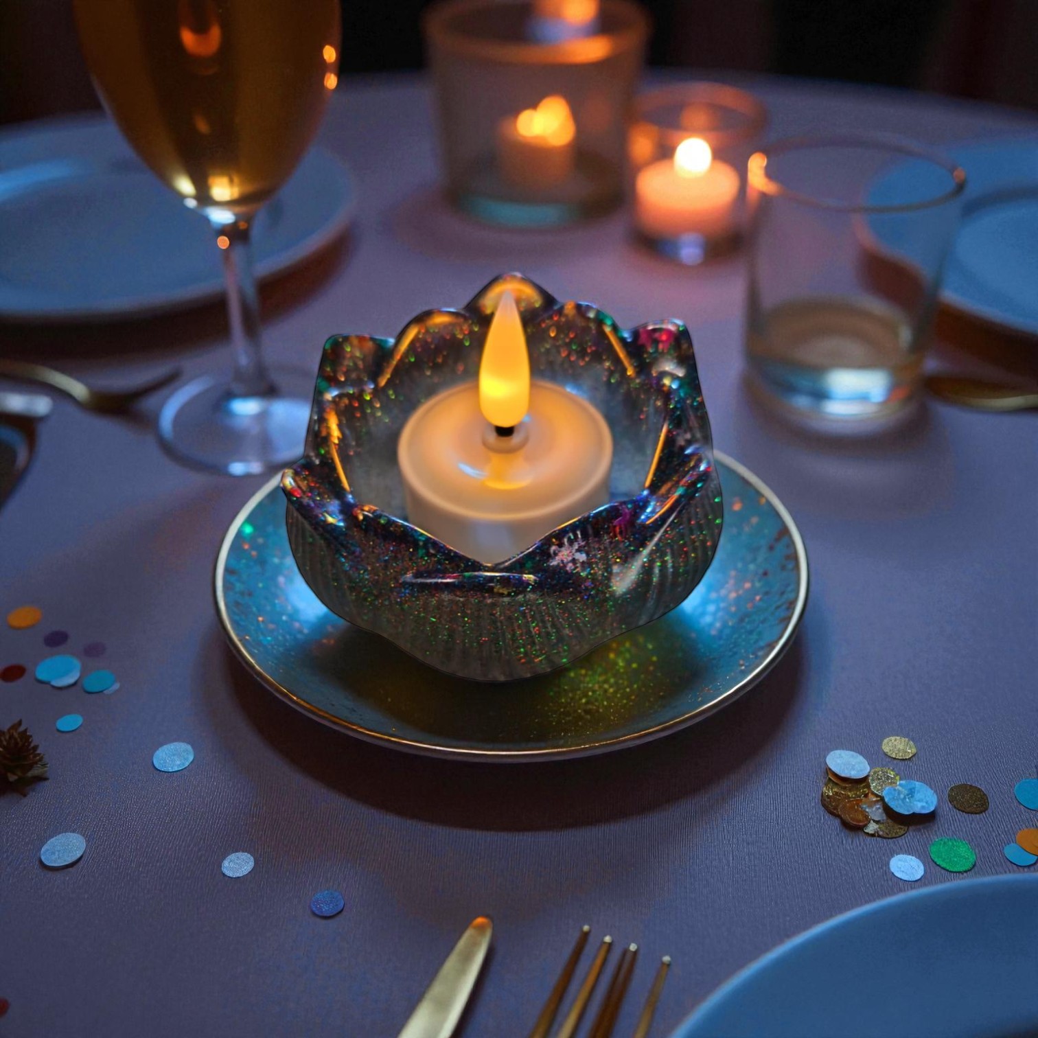 Ce porte bougie en forme de fleur de nénuphar est une pièce décorative splendide qui ajoutera une touche festive et élégante à vos occasions spéciales. Conçu en résine époxy transparente, il met en valeur un mélange de paillettes colorées, créant un effet scintillant captivant lorsque les bougies sont allumées.
