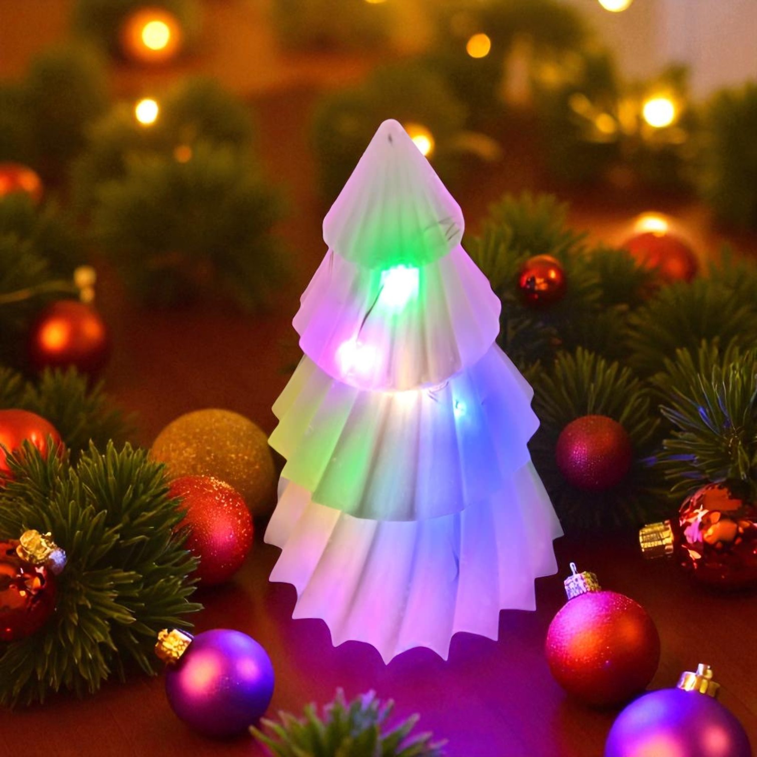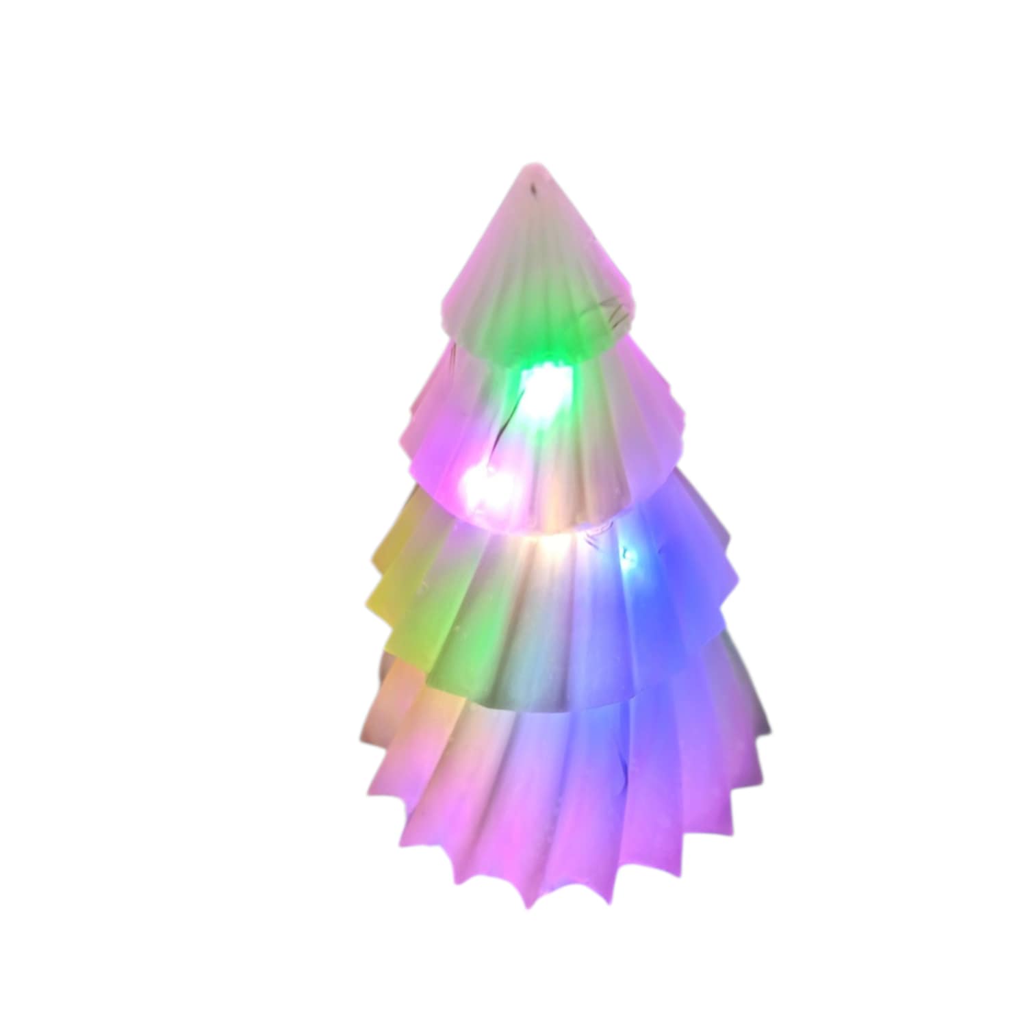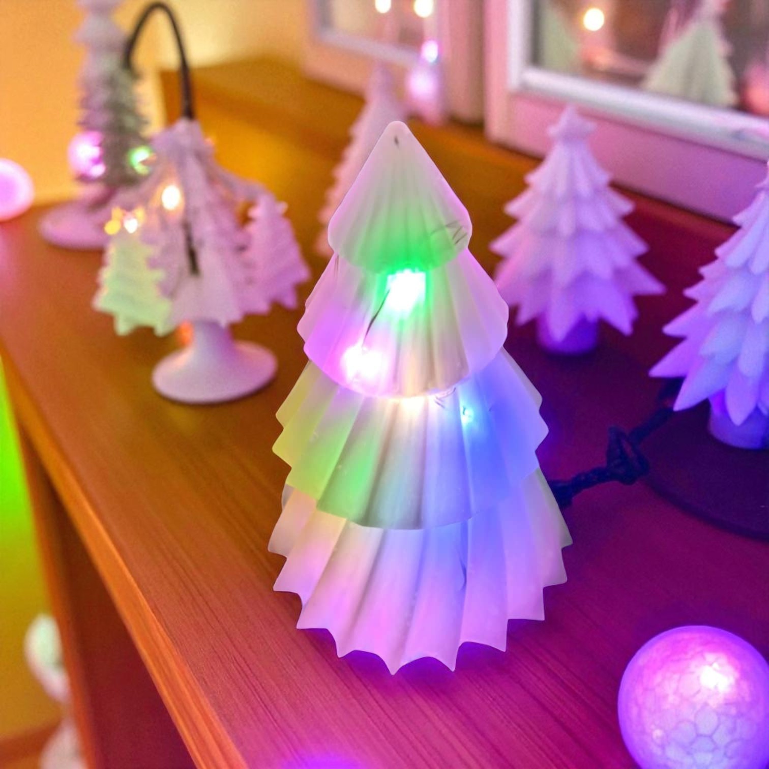 Petit sapin blanc en résine époxy au fini lisse et satiné, silhouette épurée, idéal pour rebord de fenêtre, bureau ou étagère. Il contient une guirlande LED multicolore qui diffuse un doux halo coloré et offre 3 modes d’allumage : fixe, clignotant et transition douce. Peut être réalisé dans d’autres couleurs ou ambiances lumineuses — contactez votre créatrice pour personnaliser.