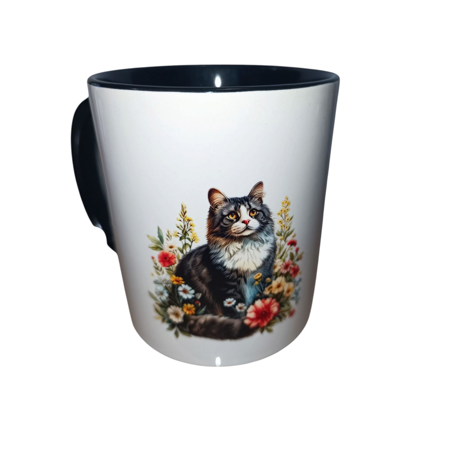 Au centre du mug, un adorable chat est représenté dans un style délicat, entouré de fleurs colorées qui apportent une note de fraîcheur et de douceur. Ce motif charmant évoque la tendresse et la beauté de la nature, tout en mettant en avant la grâce de notre petit compagnon félin.