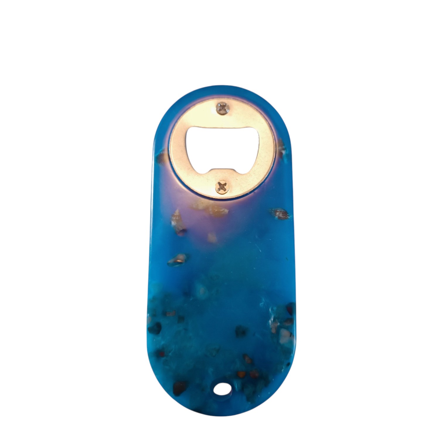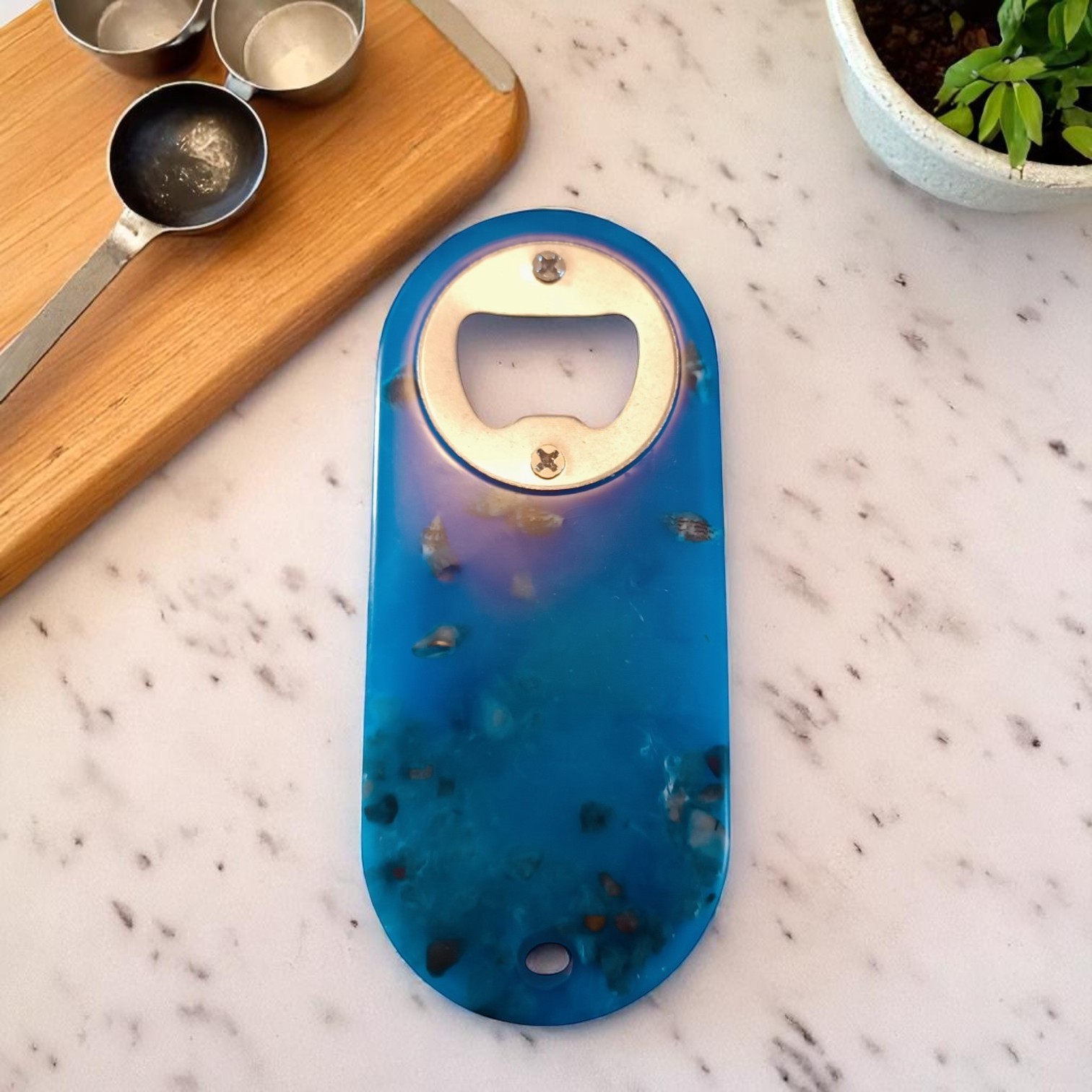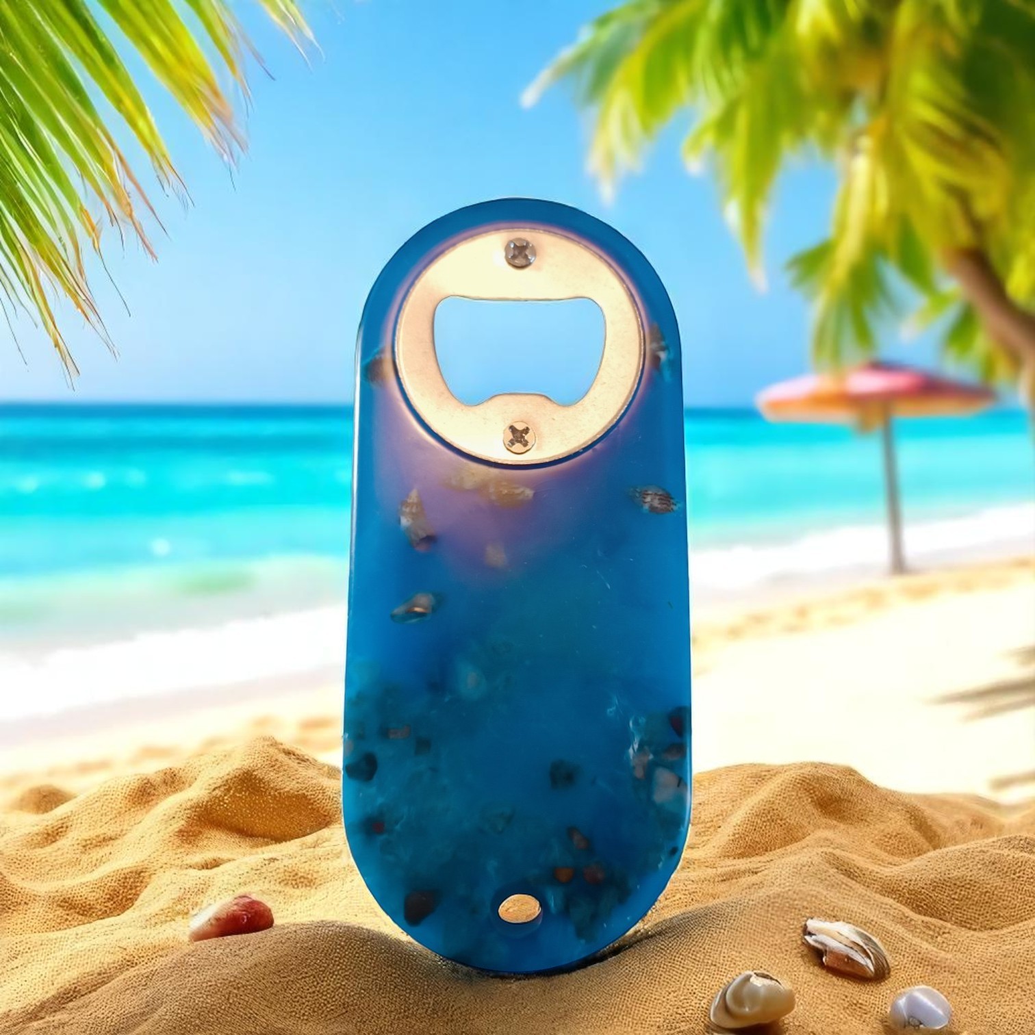 Ce décapsuleur en résine époxy bleu mer évoque l’ambiance des vacances à la plage. Il est orné de petits coquillages encastrés à l’intérieur, rappelant les souvenirs de bord de mer. Alliant beauté et praticité, il est idéal pour les amateurs de mer, de voyages ou pour apporter une touche estivale à votre collection.