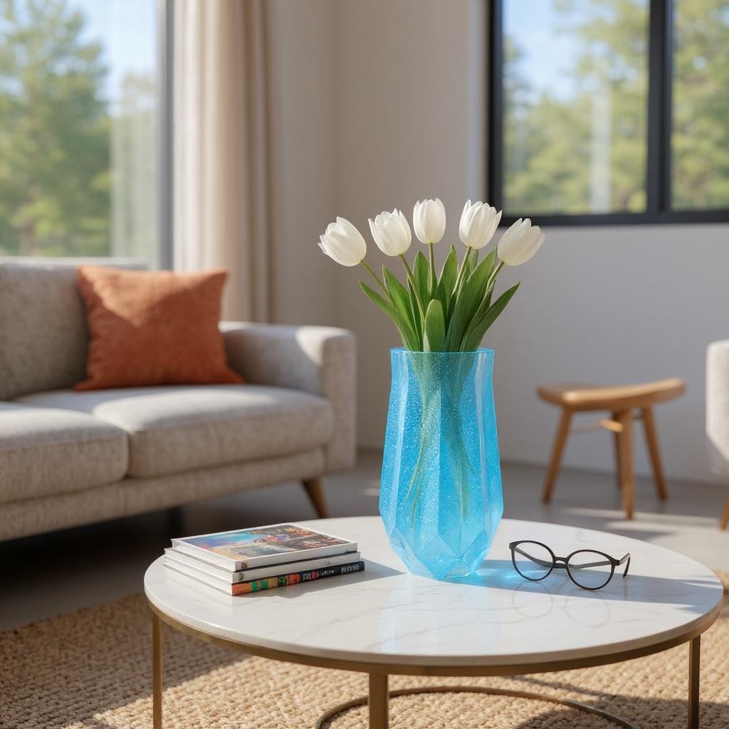 Ce vase en résine époxy bleu transparent est une œuvre d’art élégante qui embellira votre décoration intérieure. Sa couleur profonde évoque la mer ou le ciel d’été, apportant fraîcheur et sophistication. La finition brillante met en valeur sa transparence et sa teinte riche, tandis que sa forme raffinée aux courbes douces lui confère un style moderne et chic. Idéal pour y déposer des fleurs ou simplement comme pièce décorative, il crée une ambiance chaleureuse et élégante dans votre espace.