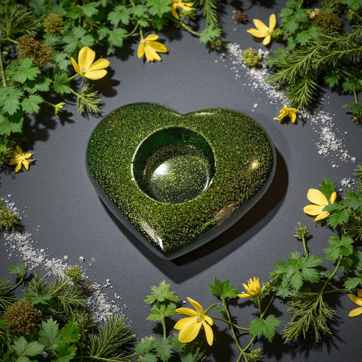 Ajoutez une touche de glamour à votre décor avec ce porte bougies en forme de cœur en résine époxy verte, un bel objet qui allie beauté artistique et fonctionnalité.