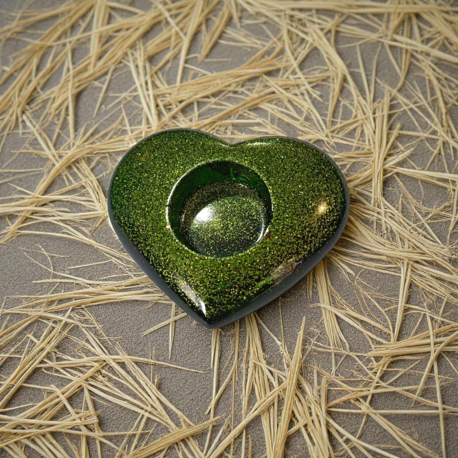 Apportez une touche romantique et scintillante à votre espace avec ce magnifique porte bougies en forme de cœur, conçu en résine époxy de couleur verte éclatante.