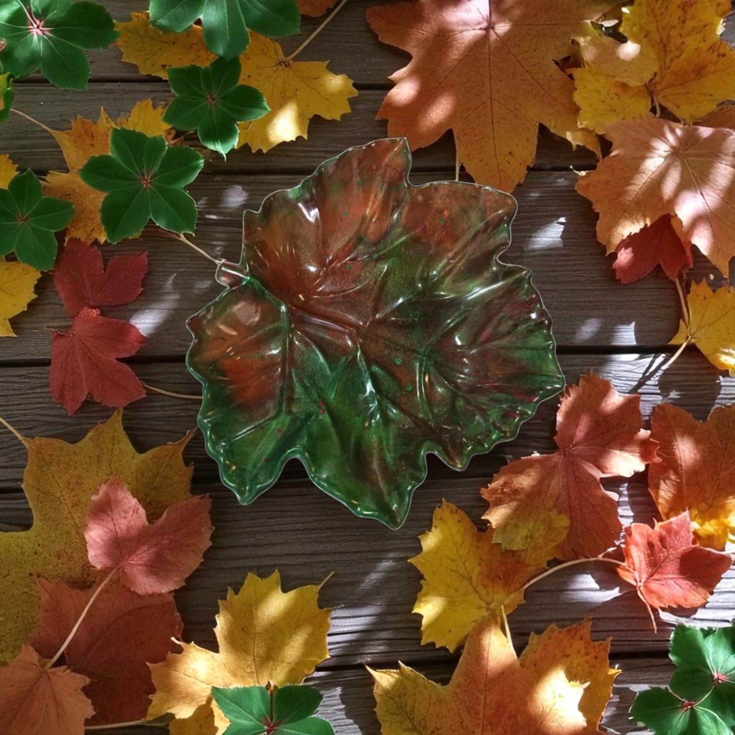 Couleurs Éclatantes : Les nuances chaudes rouge et de vert rappellent la saison automnale, tandis que la finition brillante en résine époxy ajoute une touche d’éclat, capturant la lumière de manière magnifique.