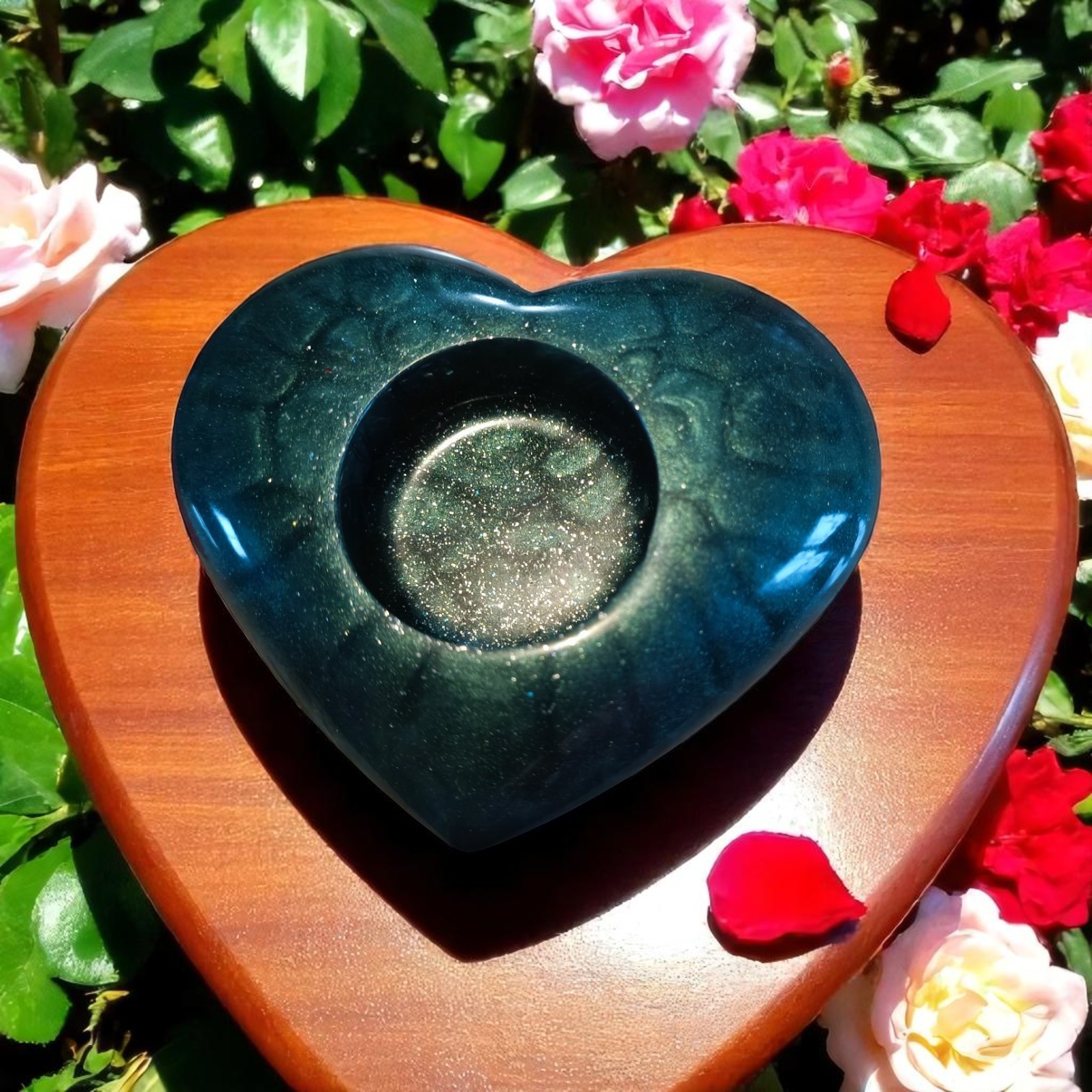 Ce magnifique porte-bougie en forme de cœur est une pièce élégante et raffinée, conçue en résine époxy de haute qualité. Sa teinte vert foncé profond lui confère une allure sophistiquée et apaisante, idéale pour créer une ambiance chaleureuse et intime. La finition brillante de la résine lui donne un aspect lisse et lumineux, mettant en valeur la richesse de sa couleur. La forme en cœur symbolise l’amour et la tendresse, faisant de cet objet un cadeau parfait ou une décoration charmante pour votre intérieur. Sa conception en résine époxy assure une durabilité et une facilité d’entretien, tout en apportant une touche artistique et moderne à votre espace.