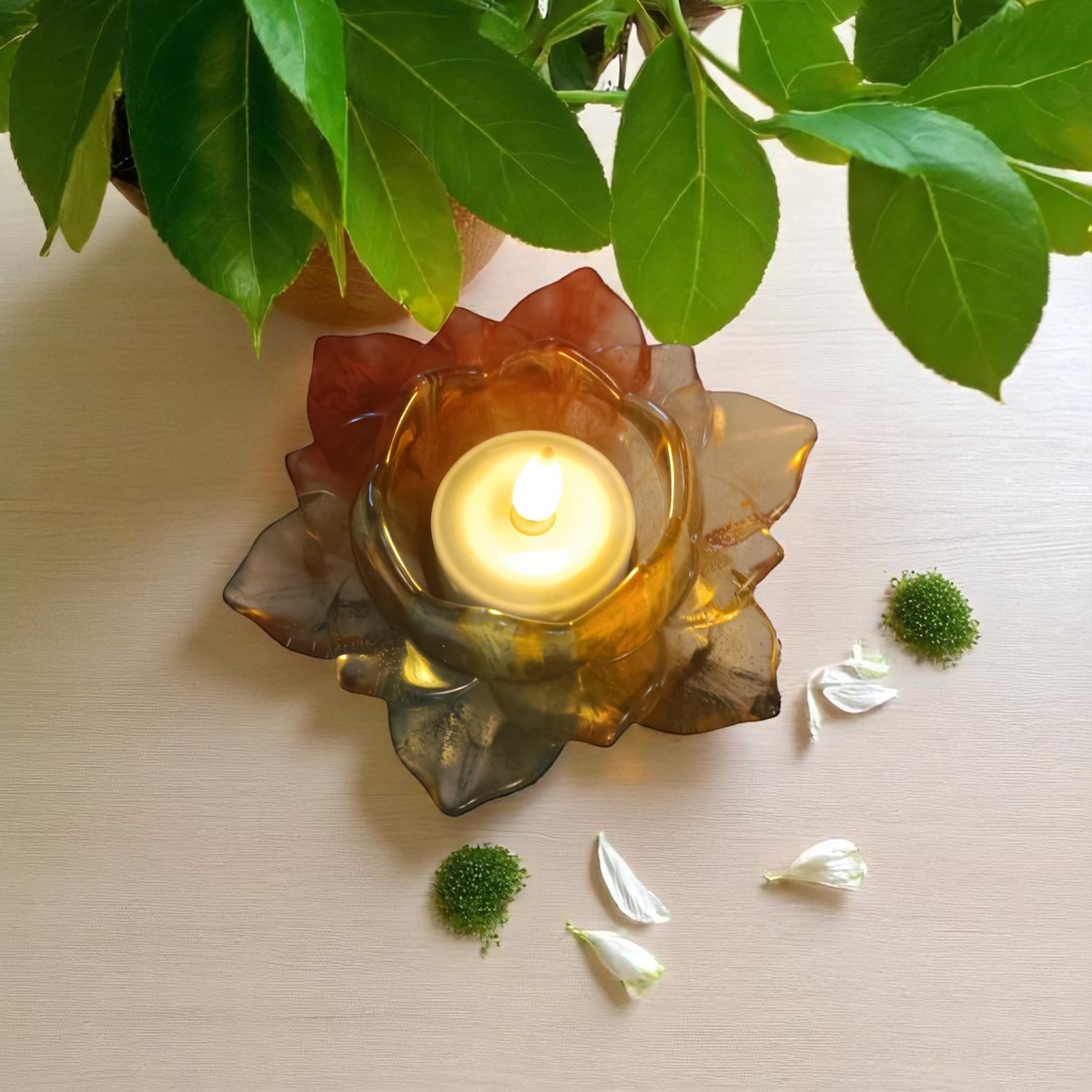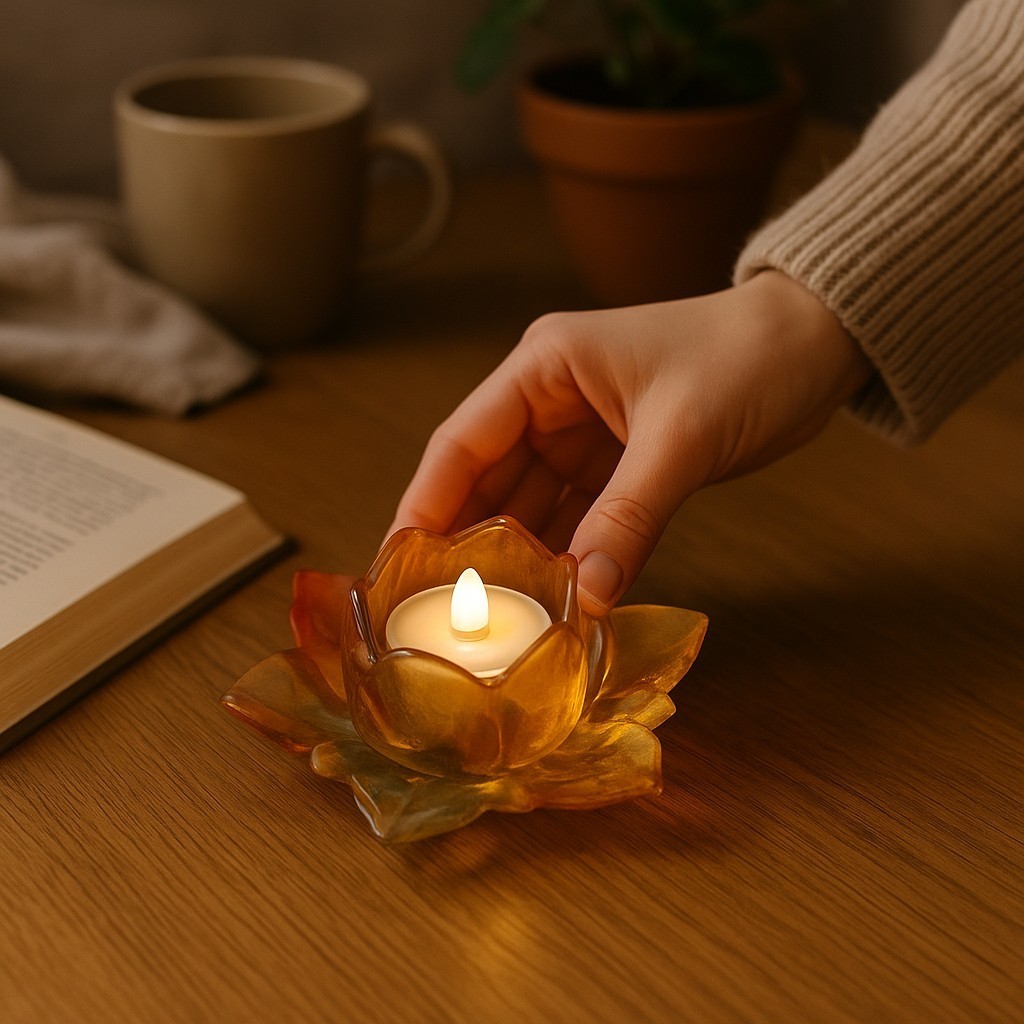 Ce porte-bougies en forme de fleur de lotus est une pièce artisanale élégante, fabriquée en résine époxy de haute qualité avec une finition brillante. Sa couleur automnale transparente, allant du doré profond à l’ambre, crée une ambiance chaleureuse en laissant passer la lumière doucement. La forme de lotus symbolise la pureté et la renaissance, ce qui lui confère une dimension symbolique. Idéal pour une ambiance cosy ou comme cadeau raffiné, il allie artisanat et élégance naturelle.