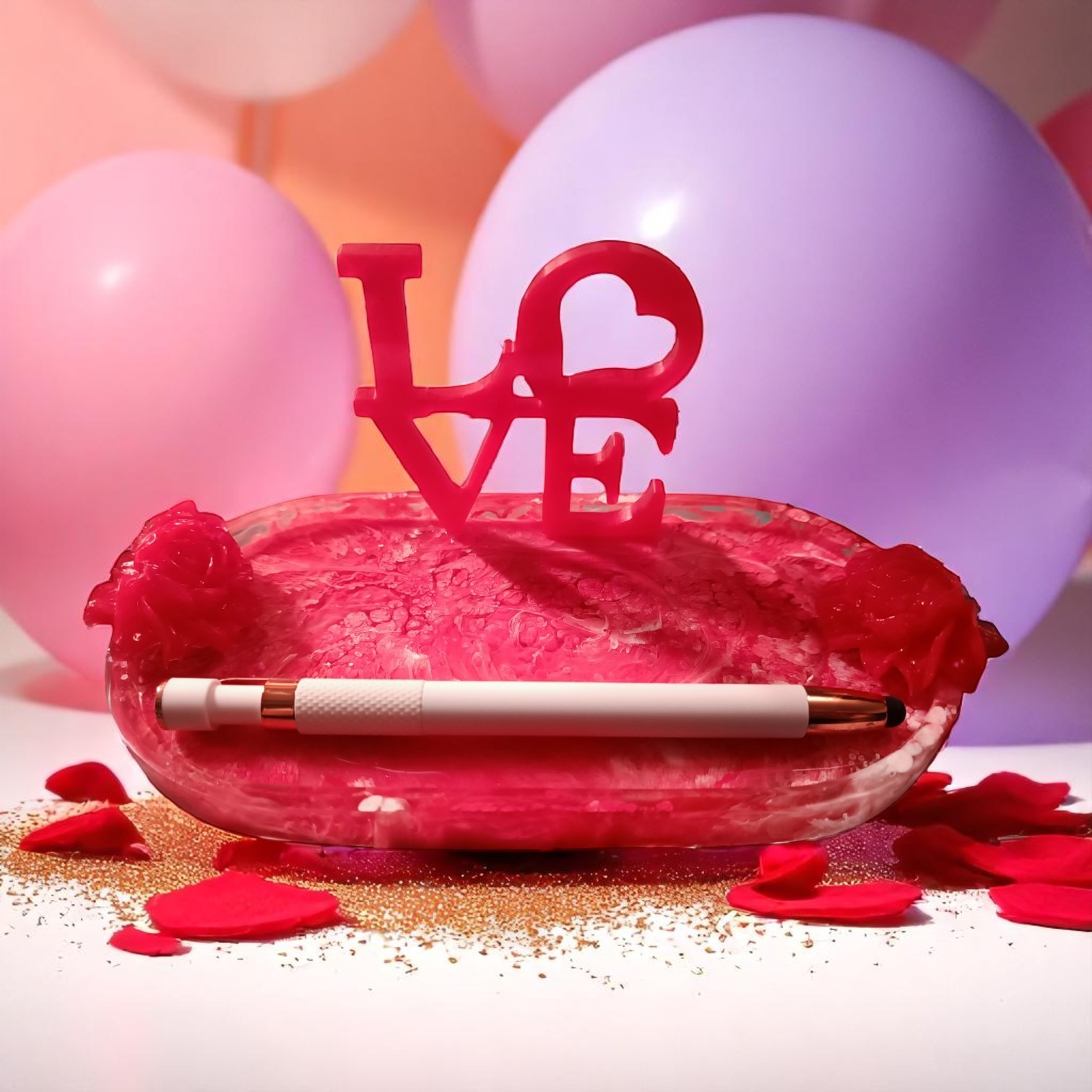 Imaginez un élégant plateau porte-stylo, conçu pour apporter une touche de sophistication et de charme à votre espace de travail. Ce modèle LOVE marbré, réalisé en résine époxy, allie parfaitement modernité et élégance. Sa surface présente un magnifique motif marbré aux nuances de rouge profond et de blanc nacré, créant un effet visuel à la fois dynamique et apaisant.