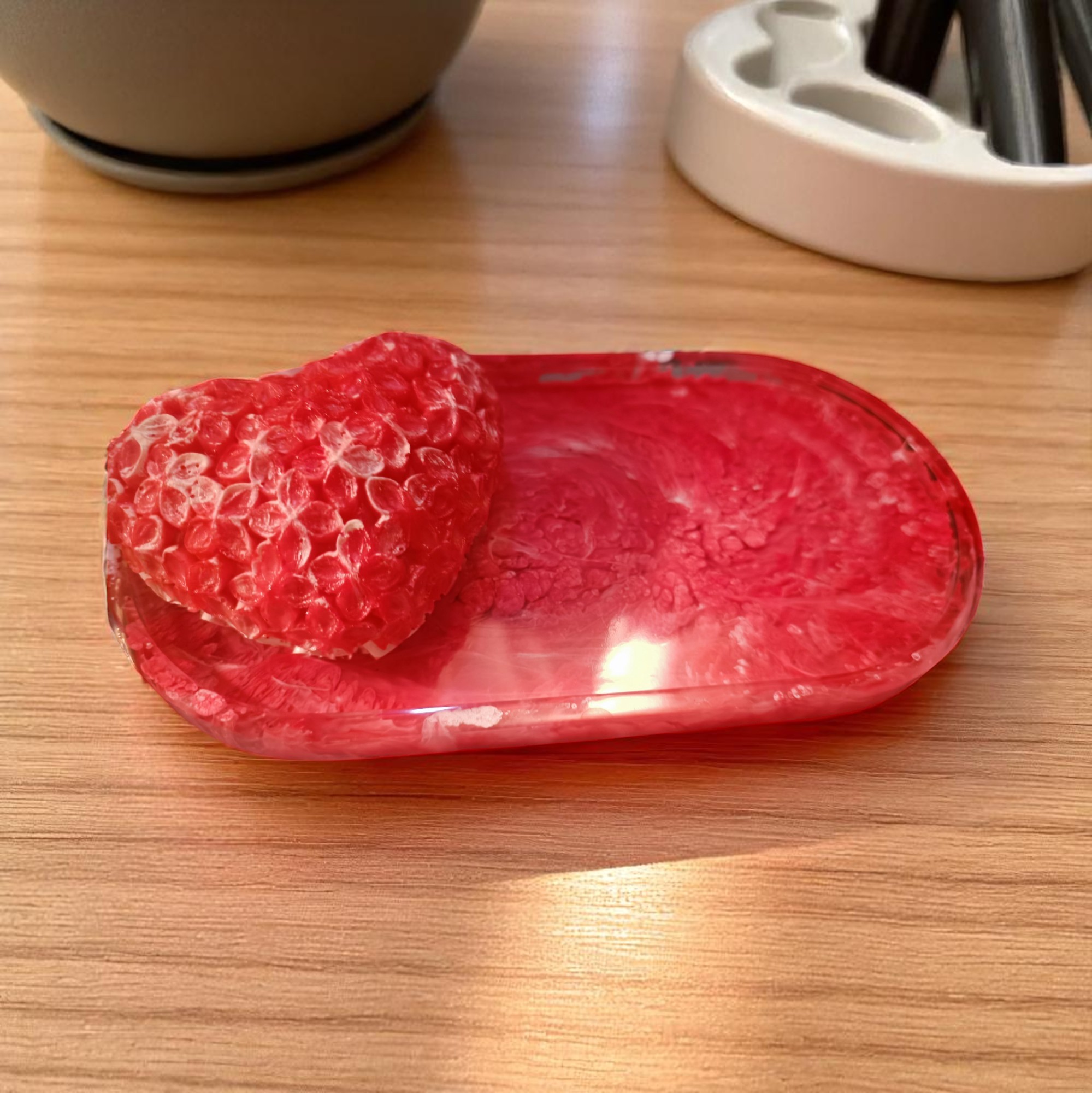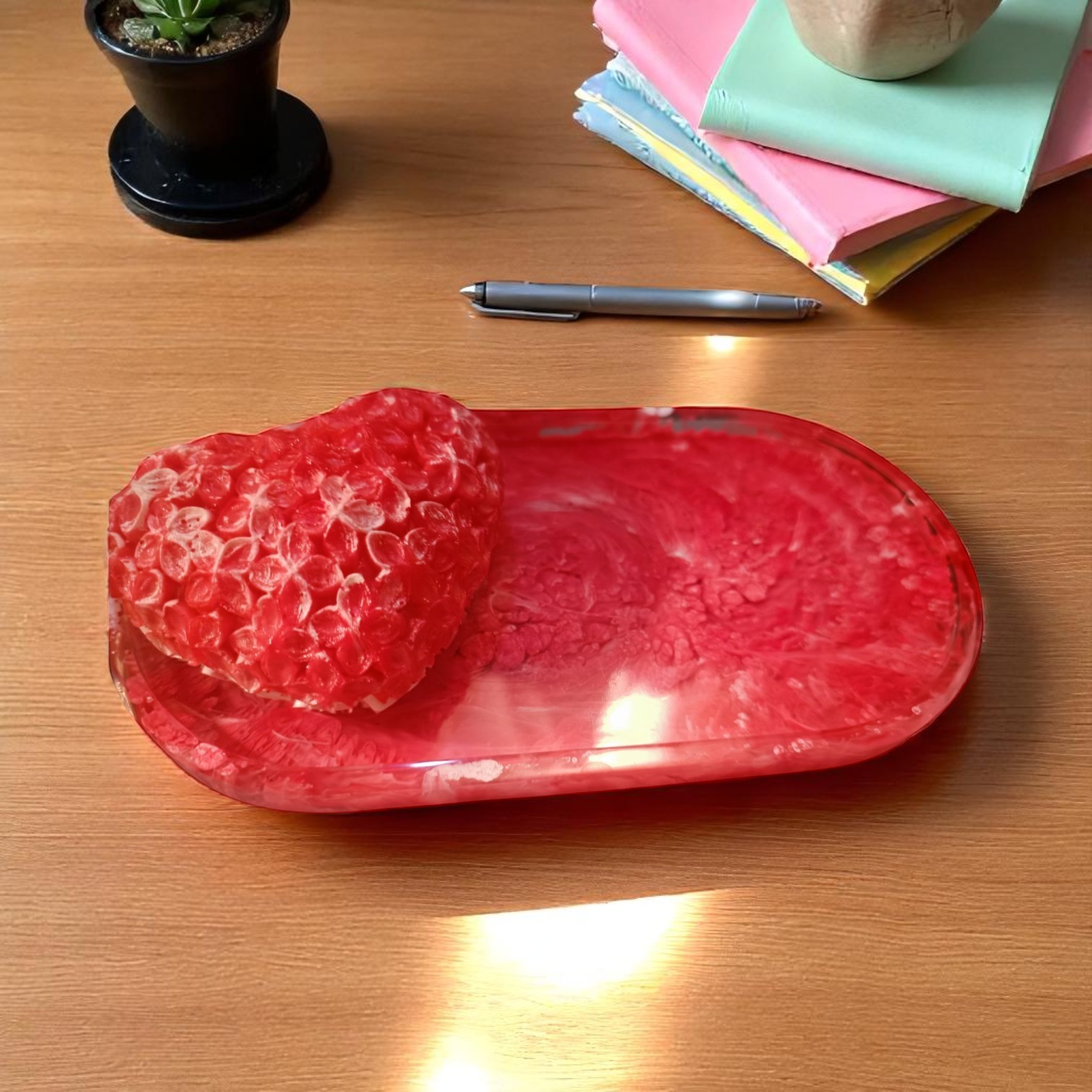 Ce petit plateau ovale en résine époxy marbrée rouge est à la fois élégant et pratique. Sa finition sophistiquée, avec ses nuances subtiles, évoque la profondeur du rouge. Au centre, un joli cœur en résine, orné de petites roses marbrées, ajoute une touche romantique et délicate. Ce cœur peut servir de presse-papiers ou d’élément décoratif. Parfait pour organiser des stylos ou décorer un coin de votre intérieur, ce plateau allie beauté et fonctionnalité avec finesse.
