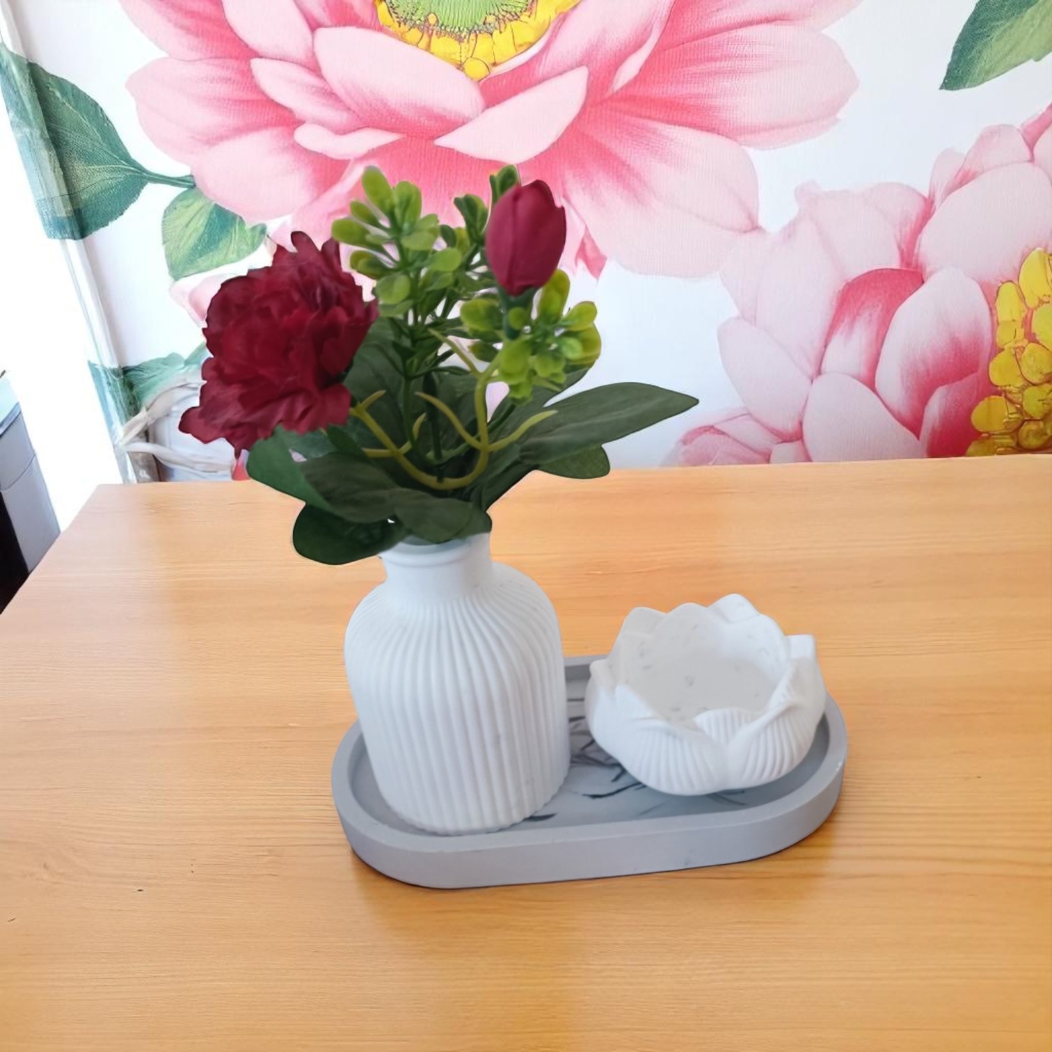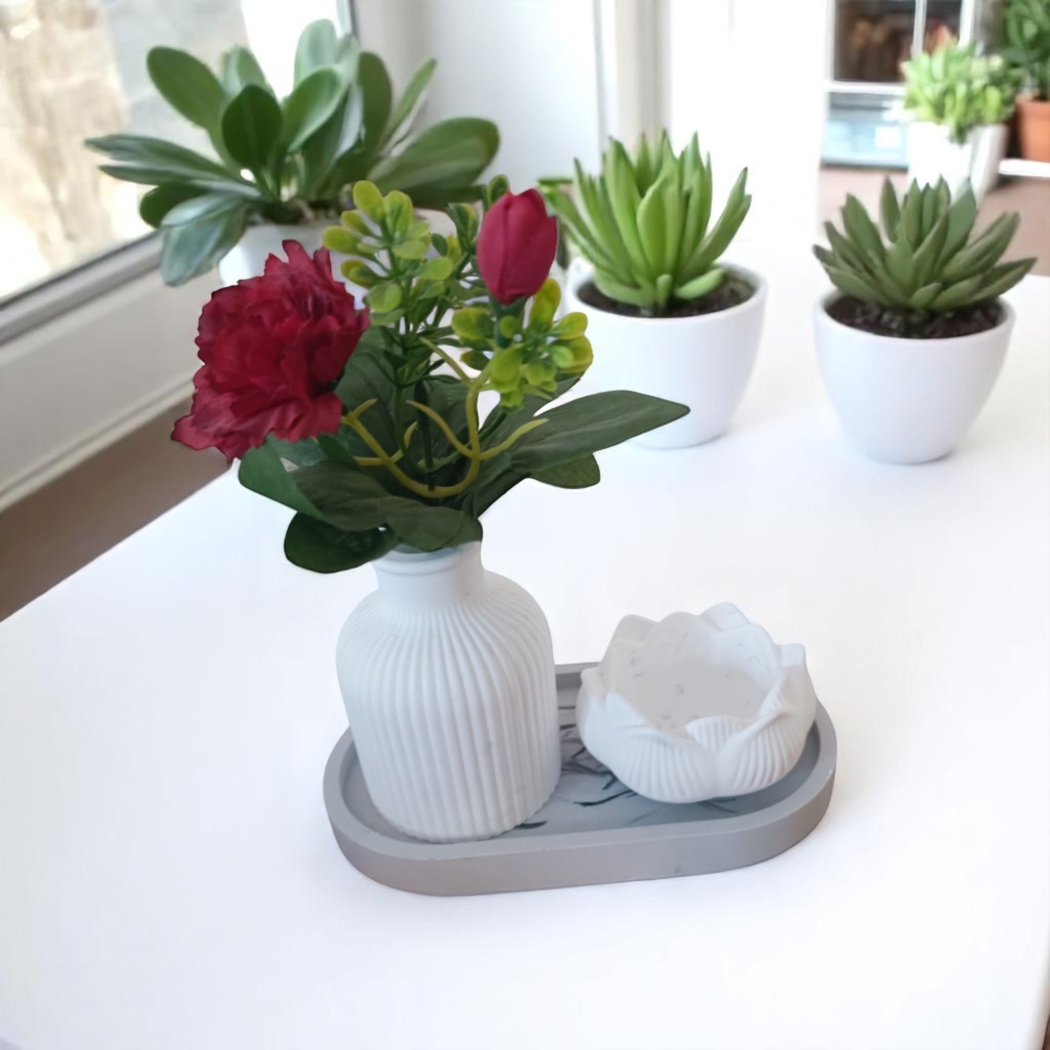 Imaginez un ensemble élégant et moderne, façonné avec soin en jesmonite, un matériau à la fois robuste et raffiné. Le plateau, de forme ovale, présente une surface lisse et matte, idéale pour accueillir des petits objets ou simplement servir de base décorative. Sa texture subtile et ses teintes naturelles, allant du gris doux au beige chaud, apportent une touche d’élégance discrète à votre intérieur.