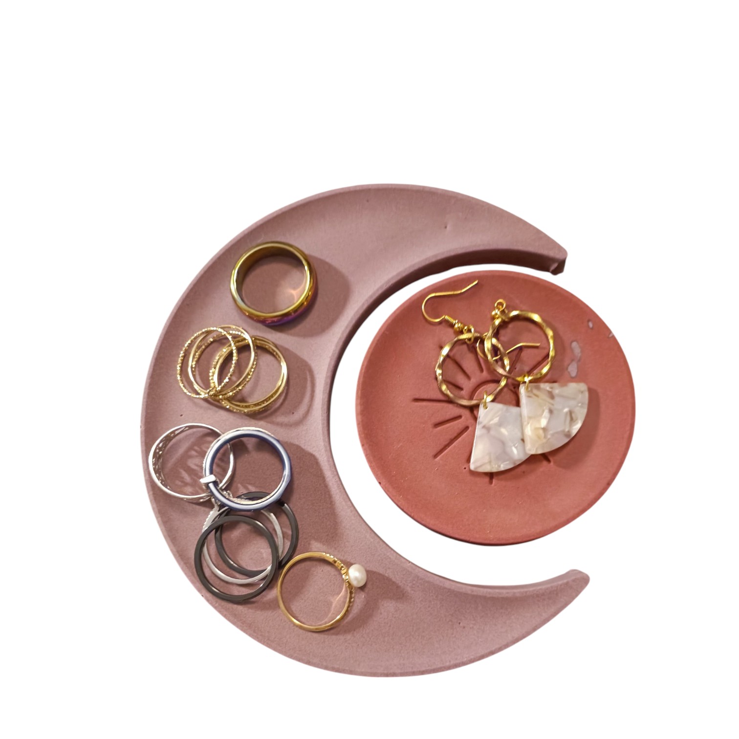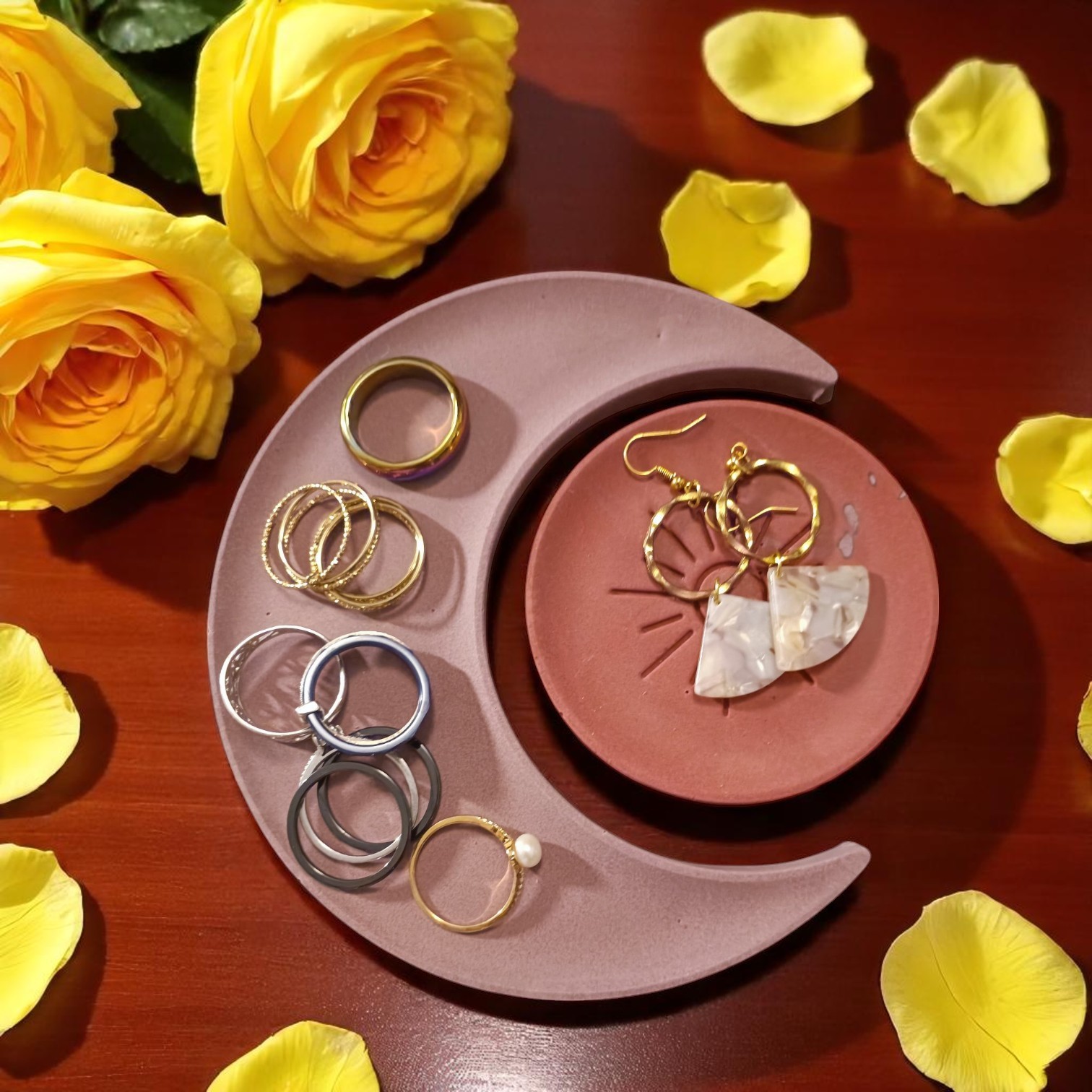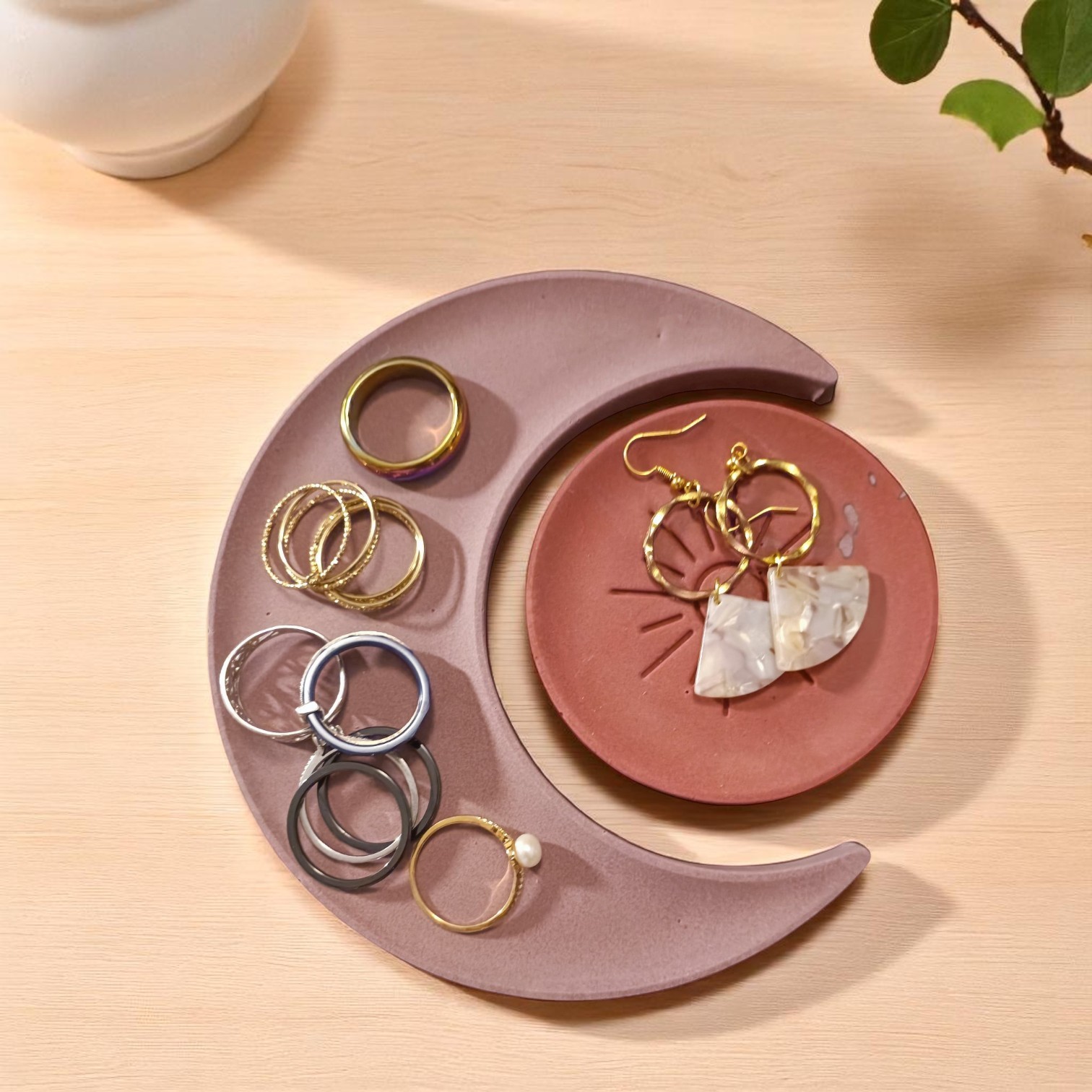 Imaginez un ensemble élégant en jesmonite, façonné avec finesse et délicatesse. La pièce principale est un croissant de lune, aux courbes douces et harmonieuses, évoquant la magie et la sérénité de la nuit. Sa couleur terre cuite rouge marron lui confère une chaleur naturelle, rappelant la terre battue ou les couchers de soleil orangés.