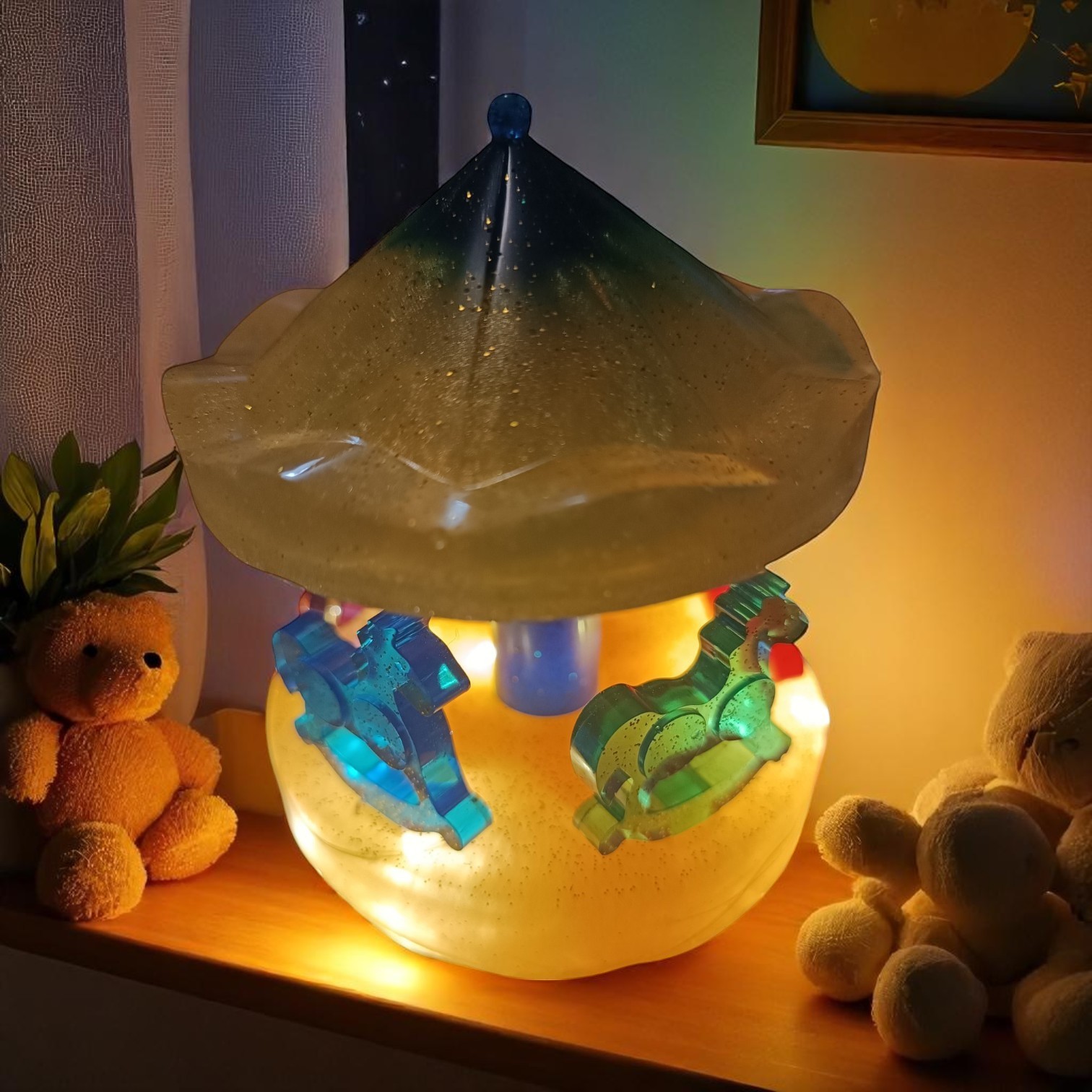 Ce petit manège en résine époxy, à la fois décoratif et veilleuse douce, représente un mini manège traditionnel avec des chevaux finement sculptés et peints dans des tons chaleureux. Sa finition lisse et résistante lui donne un aspect moderne. La veilleuse intégrée diffuse une lumière tamisée, idéale pour rassurer l’enfant la nuit et créer une ambiance féerique. Compacte et légère, cette pièce allie esthétique et fonctionnalité, apportant douceur, émerveillement et confort à la chambre de votre enfant, tout en stimulant son imagination.