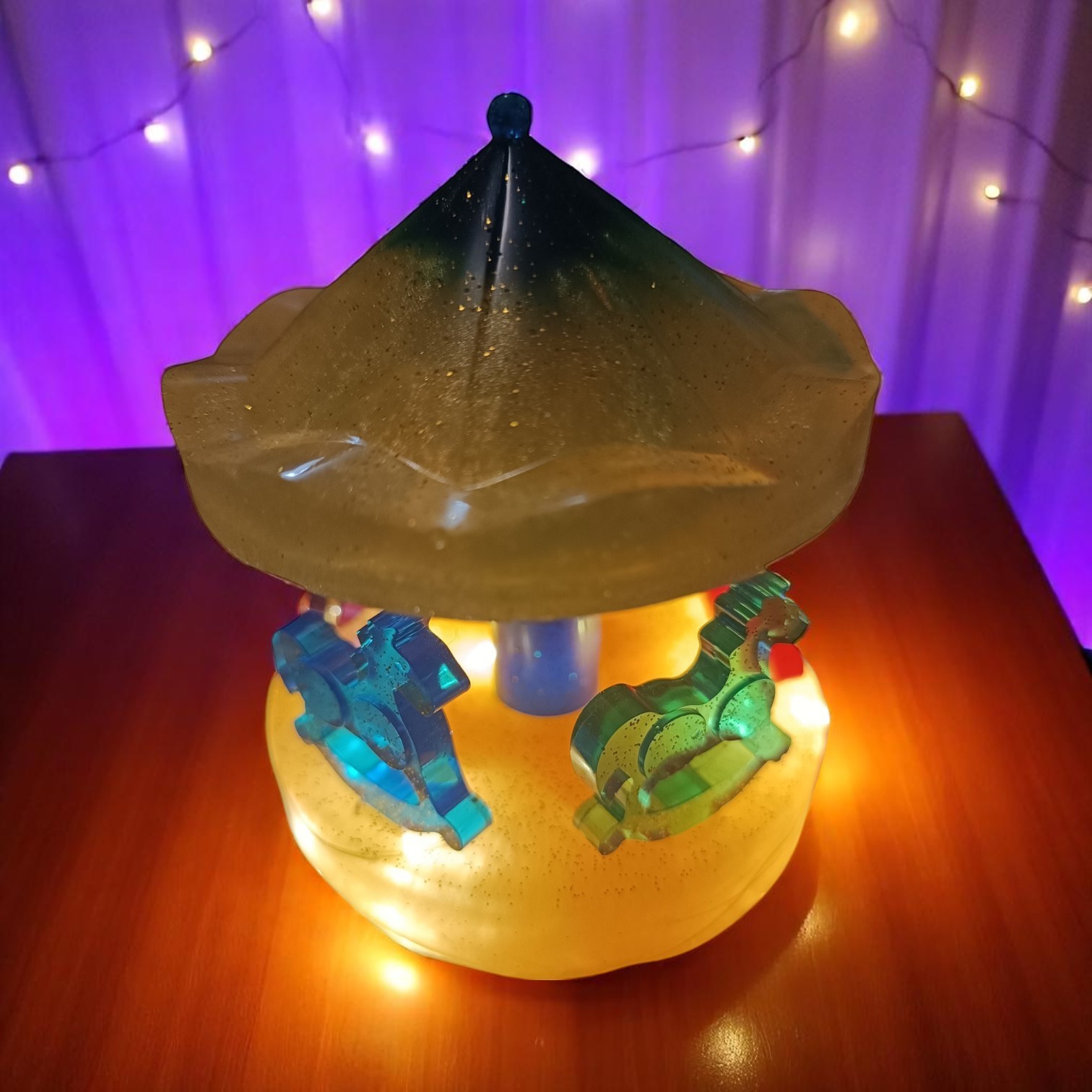 Ce charmant petit manège de chevaux de bois en résine époxy est à la fois une pièce décorative et une veilleuse douce pour la chambre d’un enfant. Sa conception minutieuse reproduit un mini manège traditionnel, avec des chevaux finement sculptés et peints dans des tons chaleureux et apaisants, évoquant la magie des fêtes foraines. La résine époxy lui confère une finition lisse et résistante, tout en apportant une touche moderne à ce classique.