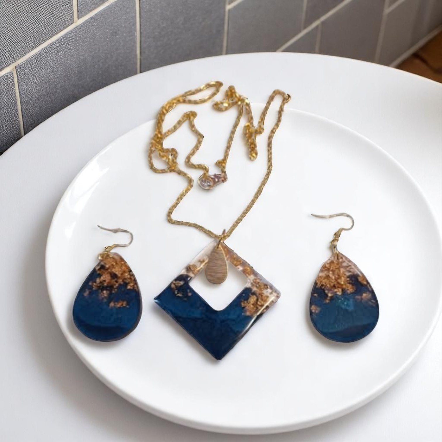 Cette parure allie la modernité de la résine époxy bleue à la richesse intemporelle de l’or, créant un ensemble à la fois contemporain et précieux. Si vous souhaitez une version plus poétique ou plus technique, n’hésitez pas à me le demander !