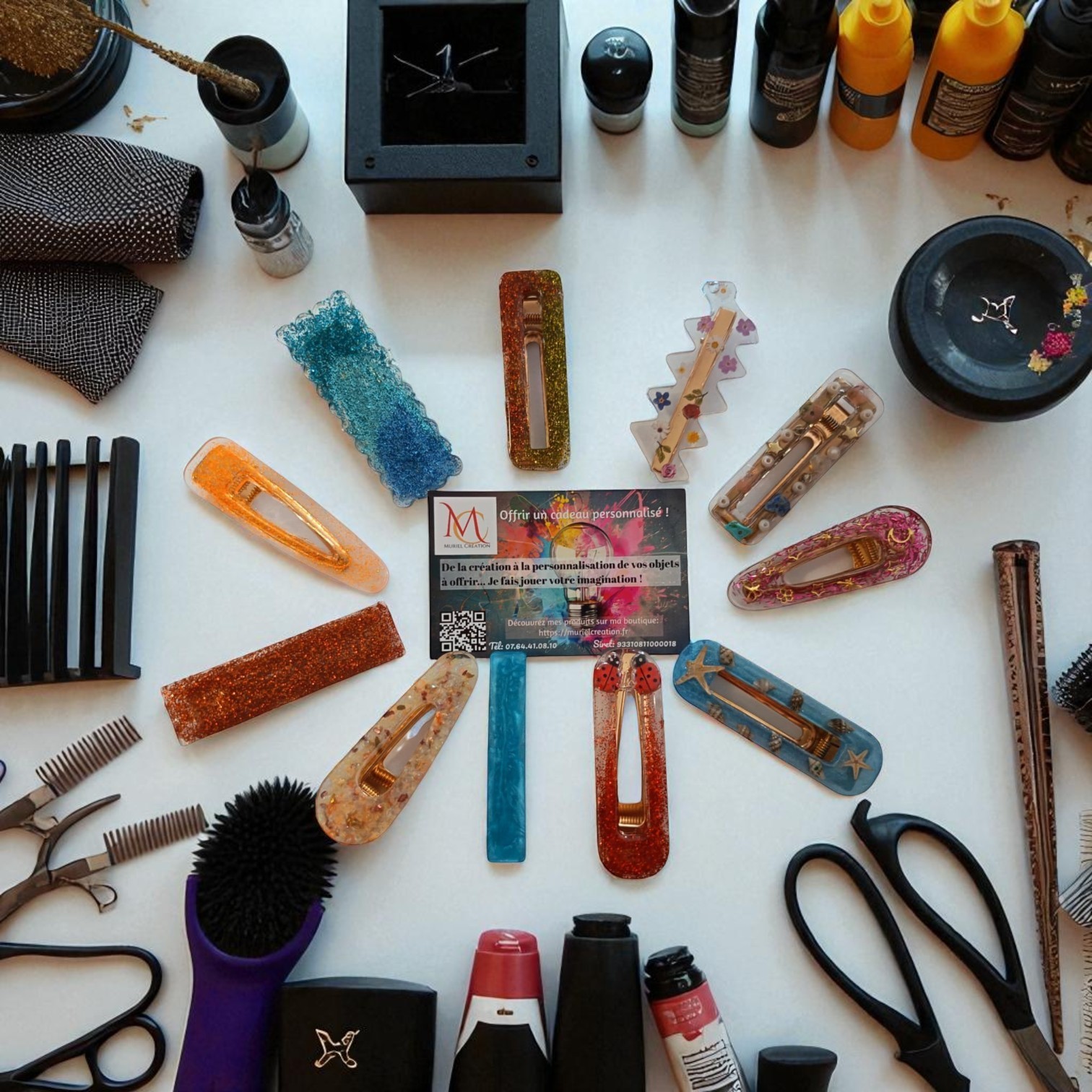 Ajoutez une touche de charme et d’élégance à votre coiffure avec nos superbes barrettes et pinces à cheveux, fabriquées avec soin en résine époxy. Chaque pièce est unique, mélangeant des motifs envoûtants et des couleurs vibrantes pour illuminer vos cheveux.