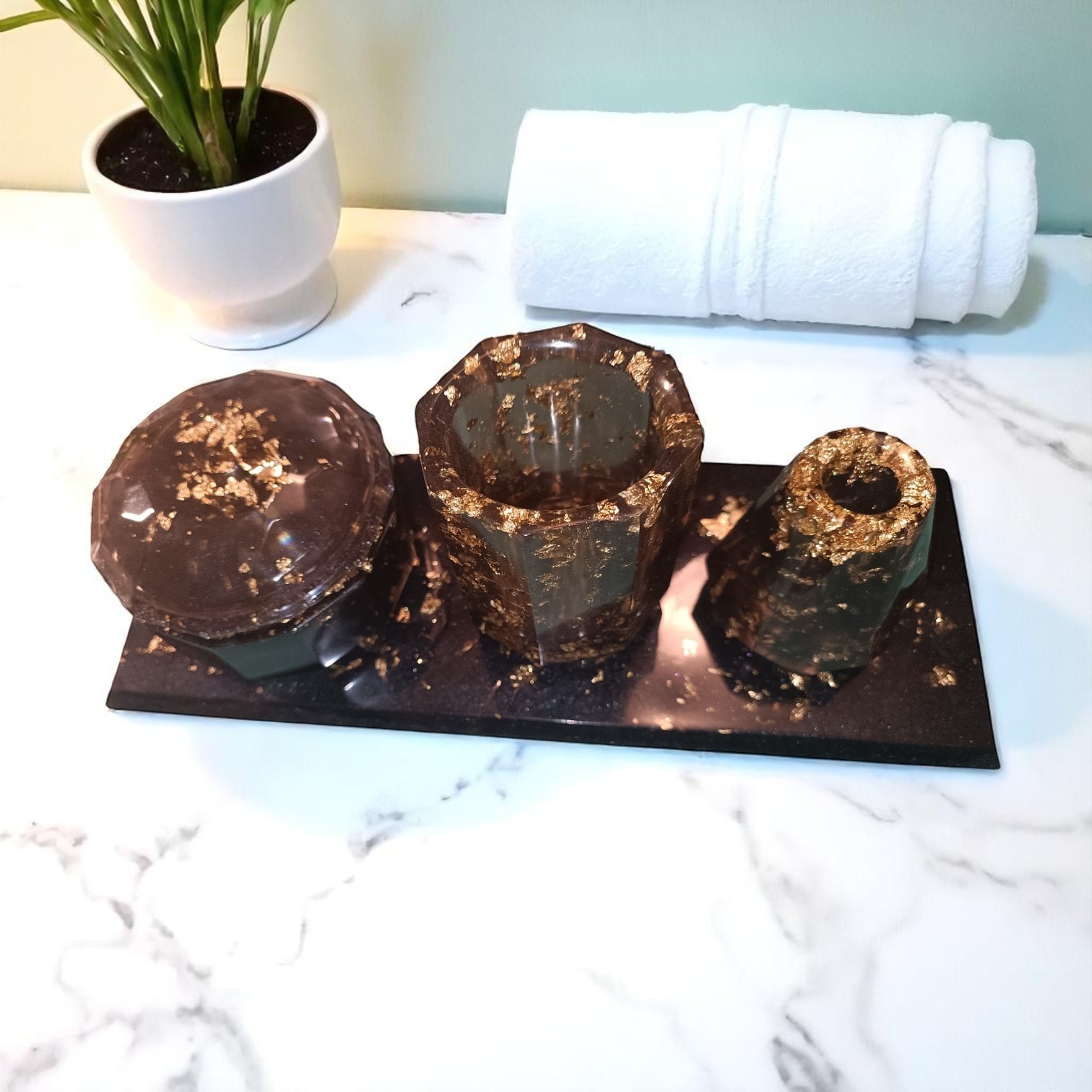 Apportez une touche de luxe et de modernité à votre salle de bain avec cet ensemble élégant en noir et feuille d’or. Le plateau, au design épuré, est réalisé en matériau robuste avec une finition noire profonde, rehaussée de délicates touches de feuille d’or qui apportent une note sophistiquée. Sur ce plateau, vous trouverez :