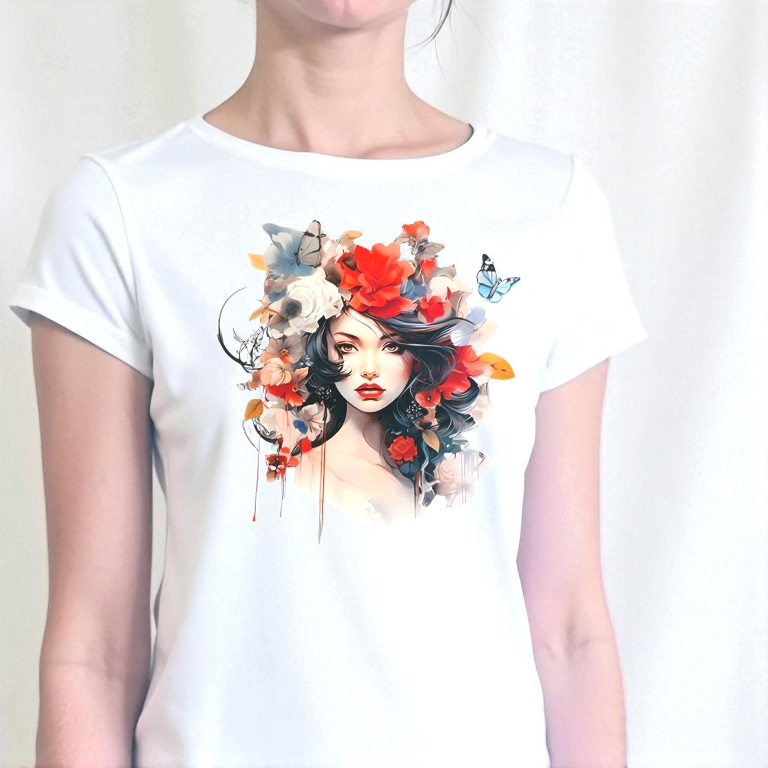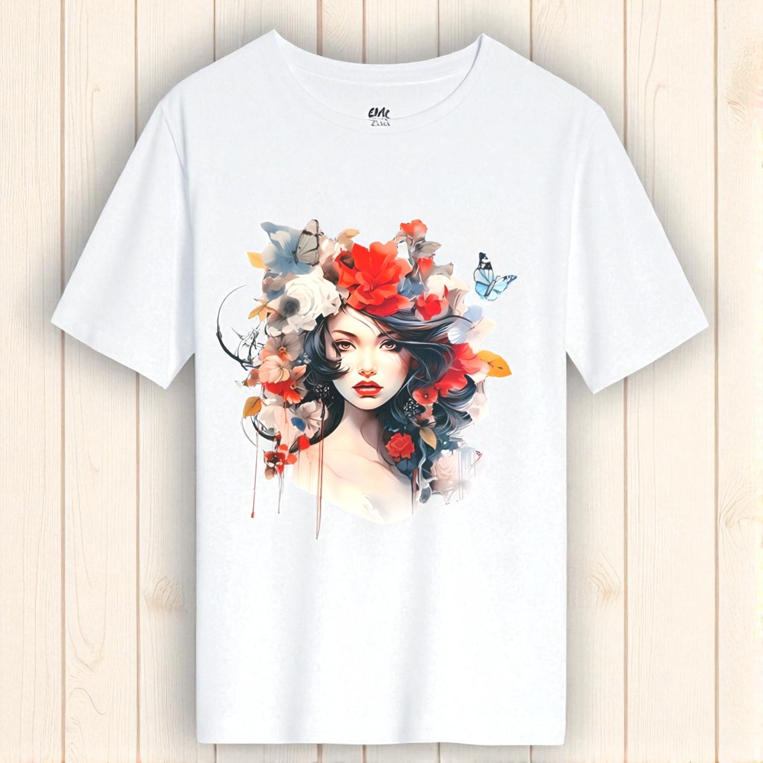 L’image montre le visage d’une femme douce et expressive, avec des traits délicats. Ses longs cheveux ondulés sont ornés de fleurs colorées qui donnent une touche de fraîcheur et de nature. L’ensemble évoque la beauté naturelle, la liberté et une connexion avec la nature, ce qui en fait un design artistique et poétique idéal pour un t-shirt blanc ou gris clair. L’auteur propose de le réaliser sur un tee-shirt et invite à le contacter pour cela.