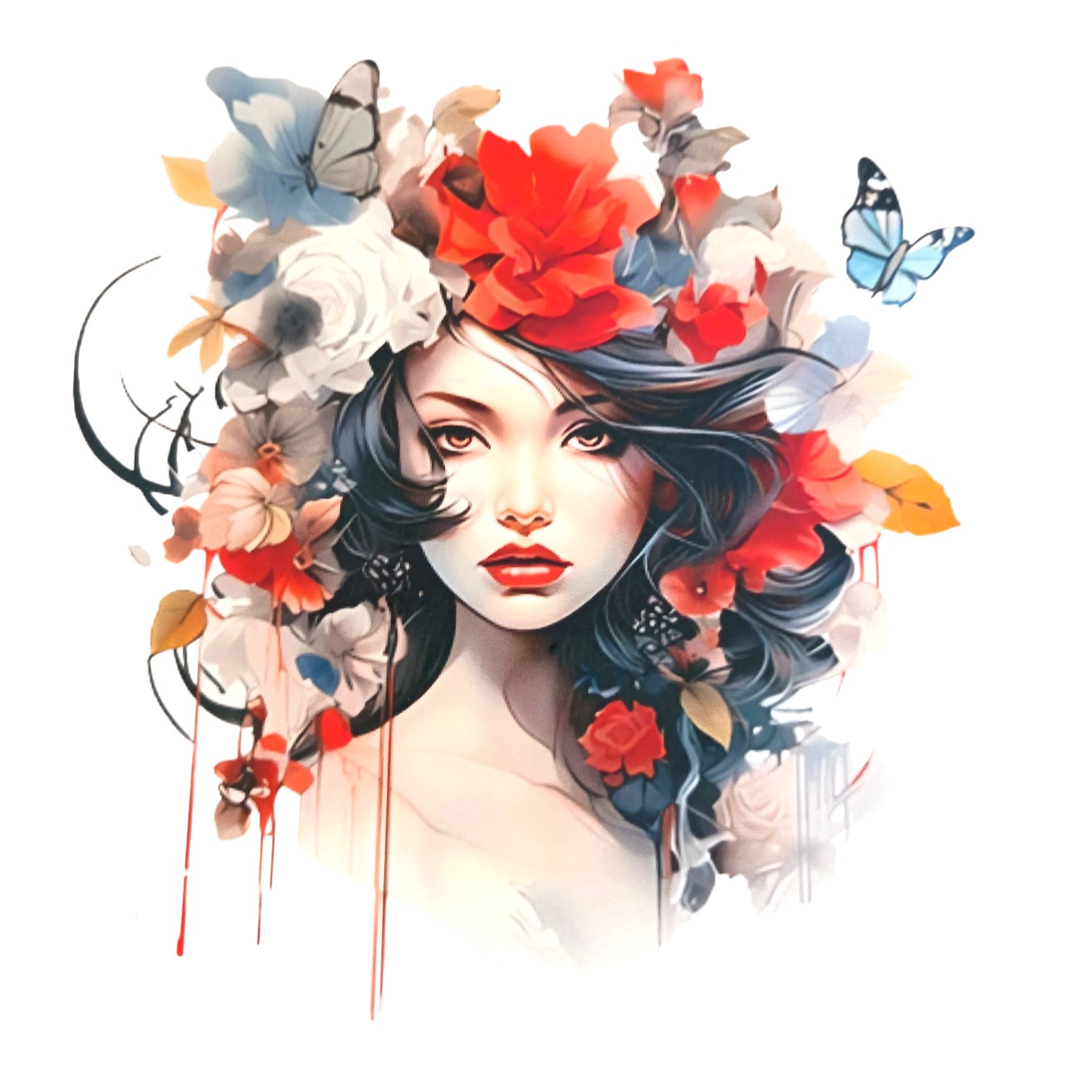 L’image représente le visage d’une femme au visage doux et expressif, avec des traits délicats et harmonieux. Ses cheveux longs, fluides et légèrement ondulés, encadrent son visage avec élégance. Au sein de sa chevelure, de magnifiques fleurs colorées se mêlent harmonieusement, apportant une touche de fraîcheur et de nature à l’ensemble. Ces fleurs, aux teintes vives et variées, semblent presque sortir de ses cheveux, créant un contraste subtil mais saisissant avec la douceur de son visage. L’ensemble de l’image évoque une sensation de beauté naturelle, de liberté et de connexion avec la nature, idéale pour un design de t-shirt à la fois artistique et poétique.