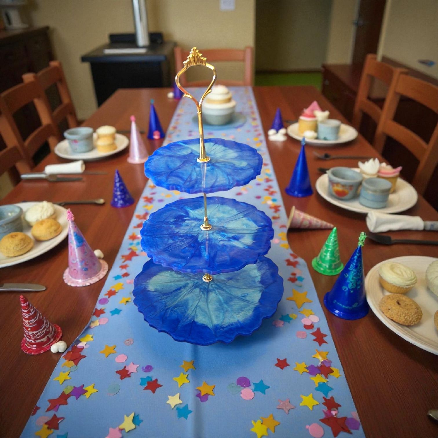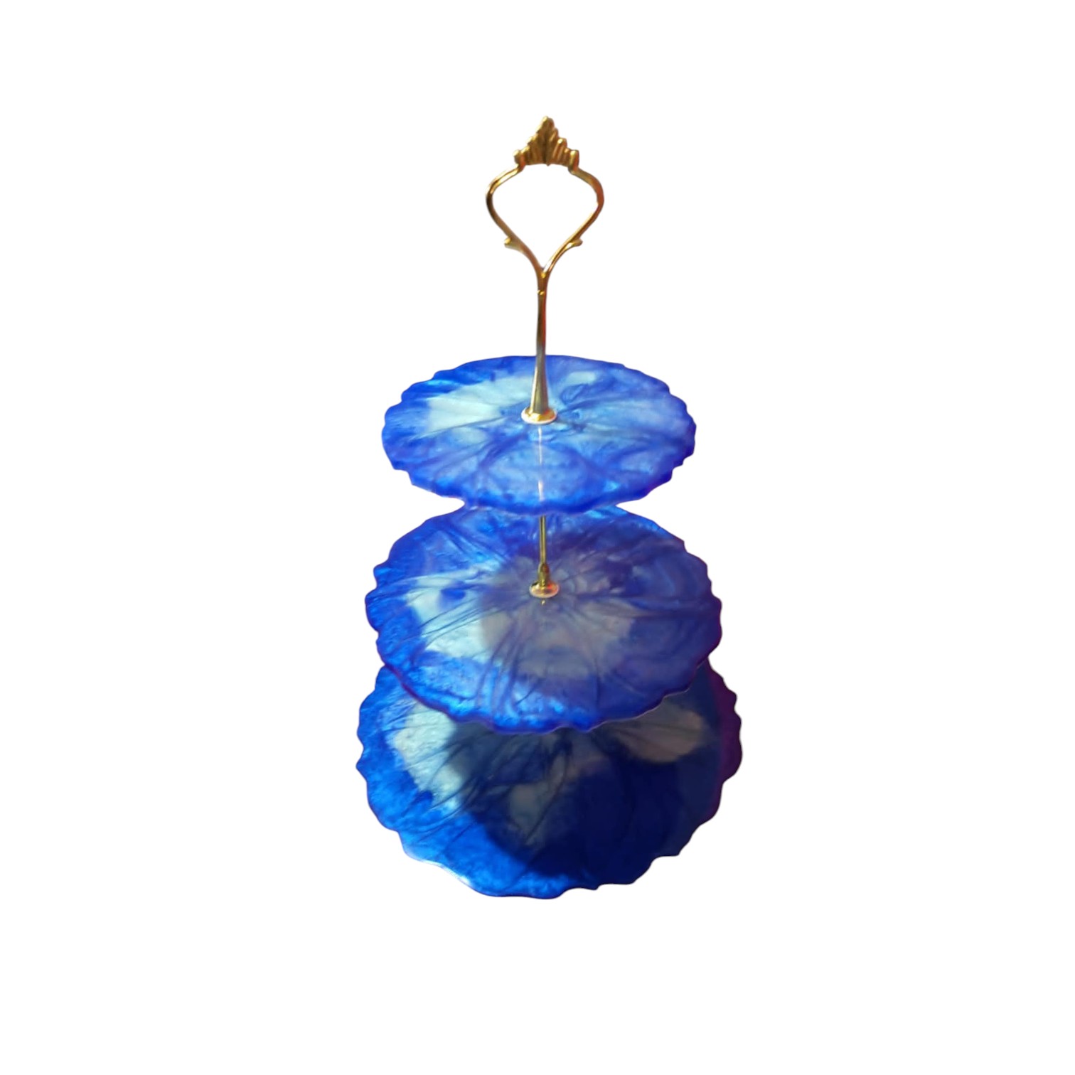 Le présentoir est de forme ronde, offrant une présentation harmonieuse de vos gâteaux, cupcakes ou autres douceurs. Ce qui le rend particulièrement unique, c’est son dégradé de couleur bleu et blanc, qui se mêle avec grâce sur chaque plateau. Les nuances bleu clair et blanc s’entrelacent pour créer un effet visuel captivant, évoquant les ciels d’été ou les plages paradisiaques.