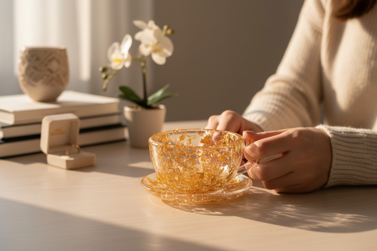 Design Luxueux : Chaque tasse est ornée de véritables feuilles d’or soigneusement incrustées dans la résine, créant un effet captivant et lumineux qui attire le regard. La transparence de la résine permet à l’éclat de l’or de scintiller sous la lumière, ajoutant une dimension artistique à chaque gorgée.